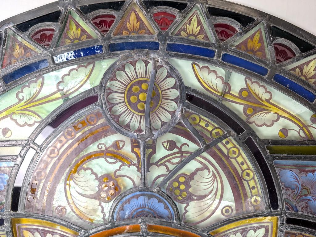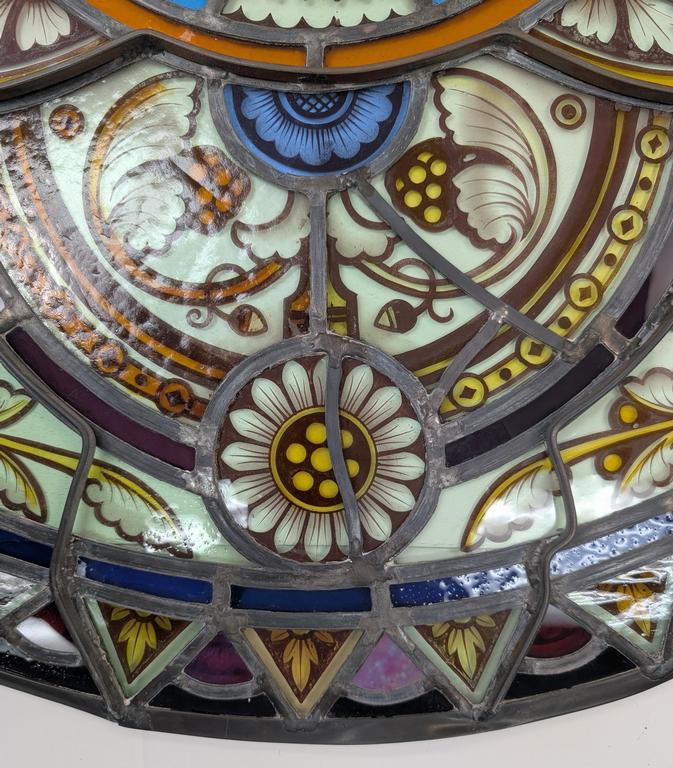 Circular stained glass panel with Victorian Gothic rose window design. 39 1/4" dia.