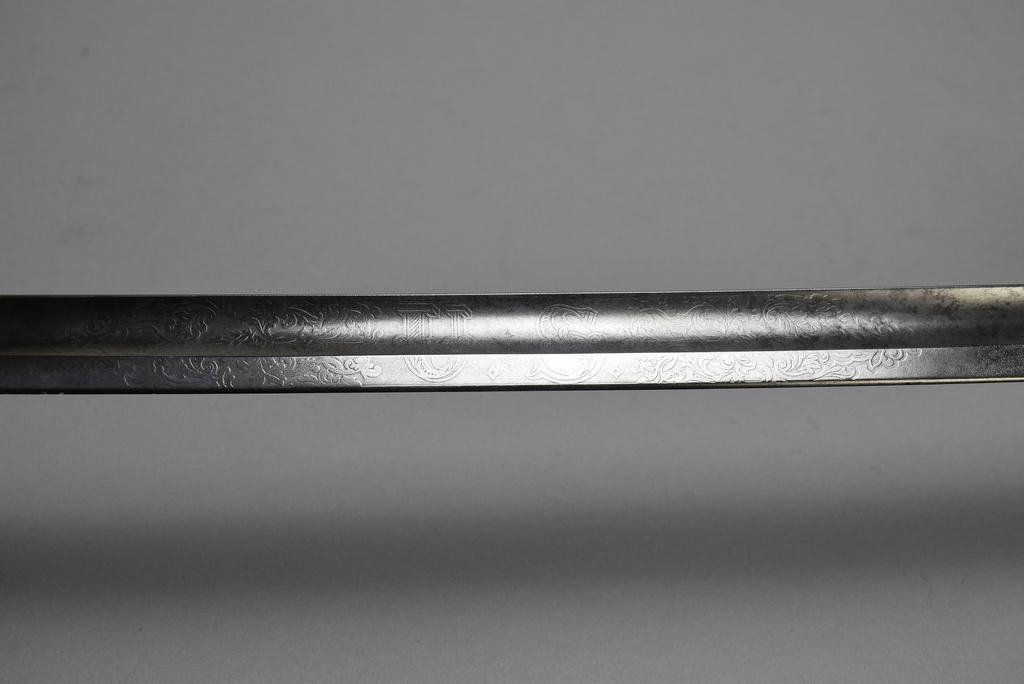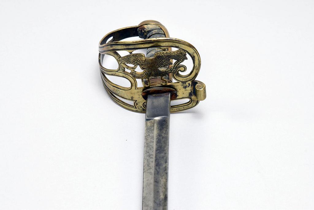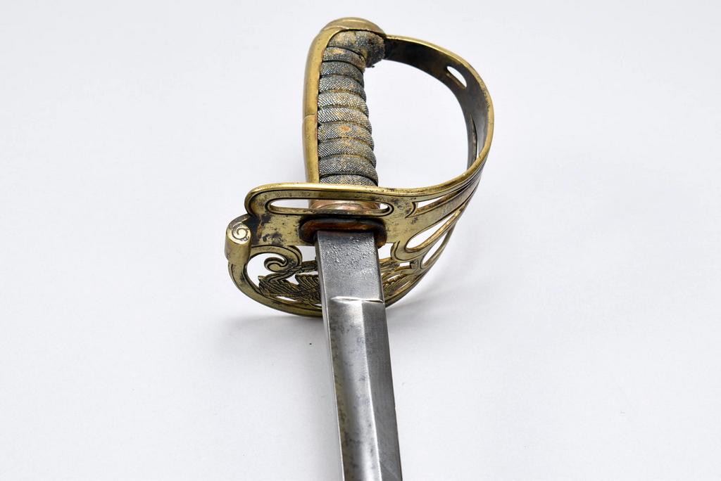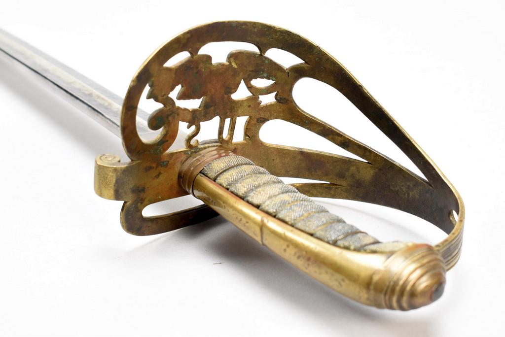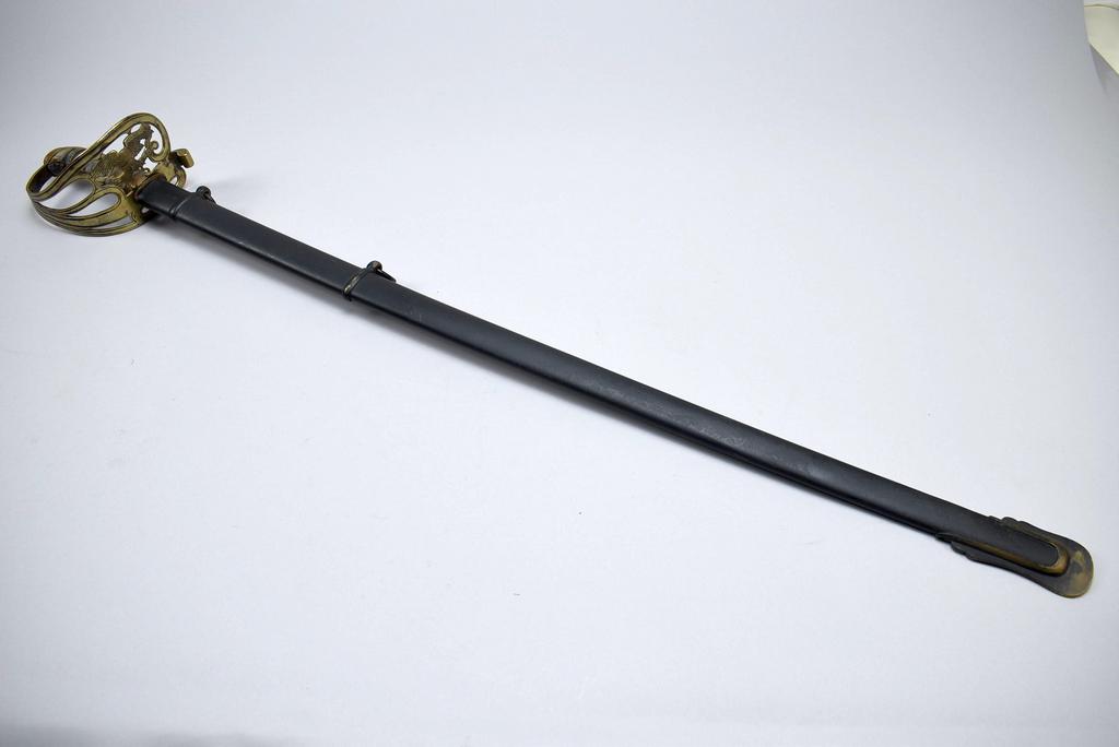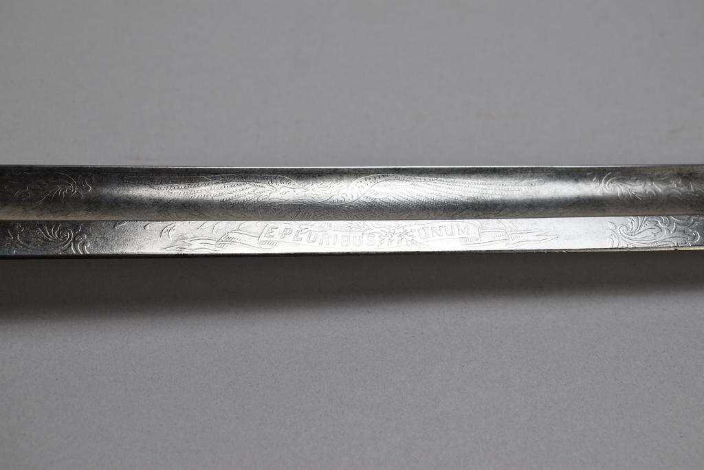 Civil War Era Non-Regulation Union officer's sword and scabbard. Pierced brass guard with Eagle and "U.S." Slightly curved blade with wide fuller. Obverse etched "U.S." with foliage and scrolls. Opposite side etched with Eagle and "E. Pluribus, Unum." Sword: blade 32.25 in. overall 37.5 in. Scabbard 33 in. long.
