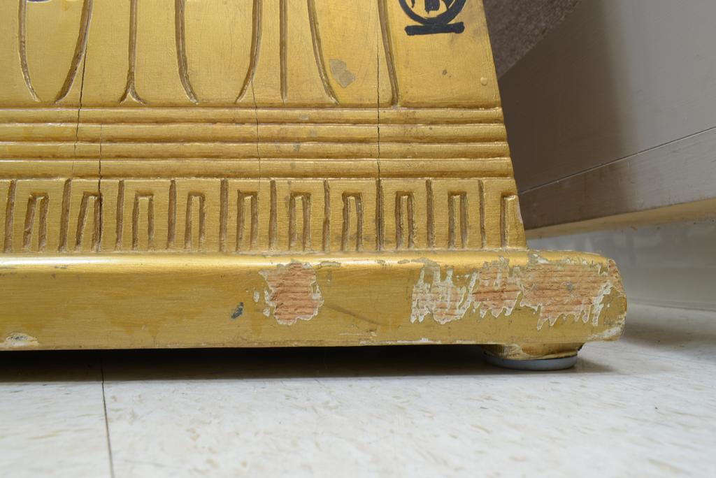 Composition Anubis sculpture on sarcophagus. Composition body, black and gilt painted, with wooden tail. Over a composition gilt painted sarcophagus. Overall: 54" W, 23" D., 62.5" H.