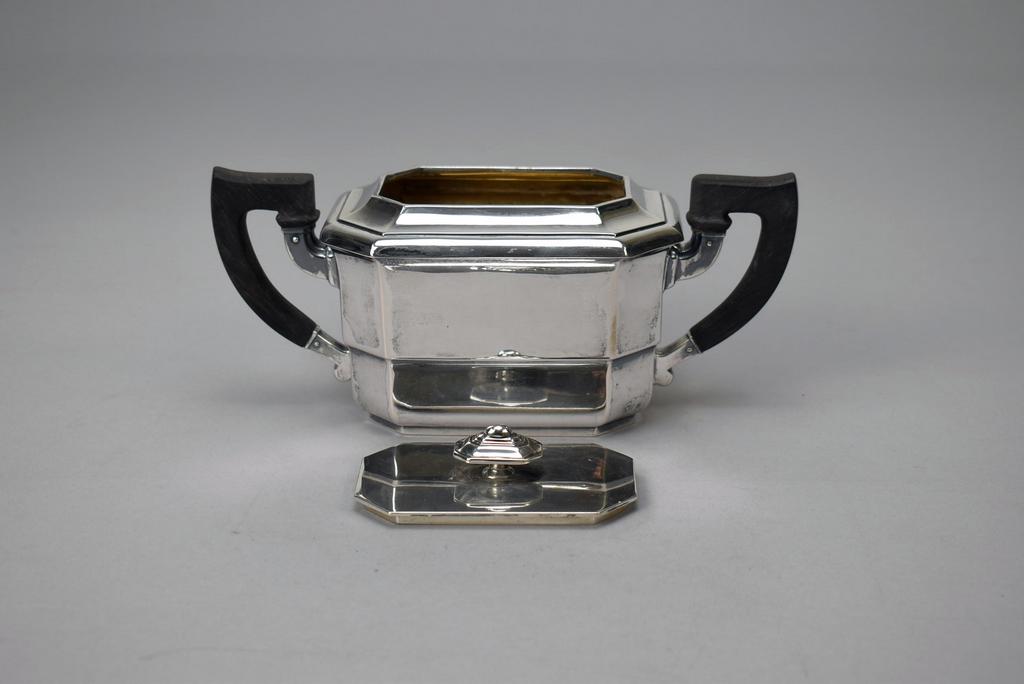 Continental 835 Silver sugar bowl. Marked 835M with 'V' mark. Wood handles. 8 1/4" W, 4 1/8" H. 11.68 troy oz.