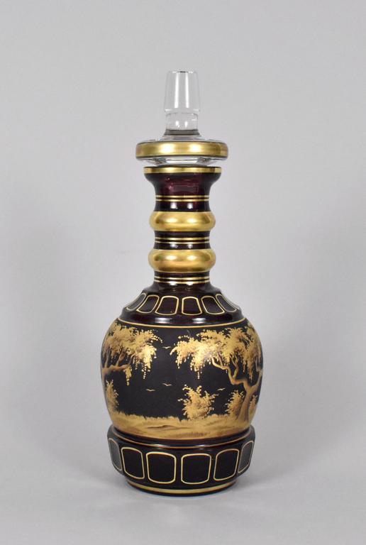 Continental amethyst glass decanter with detailed gilt painted landscape and figures on black ground. Faceted base and shoulders. 16" tall.