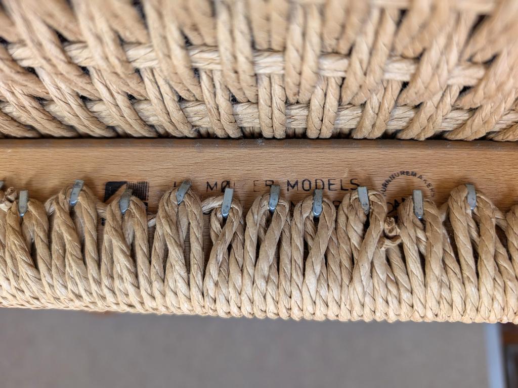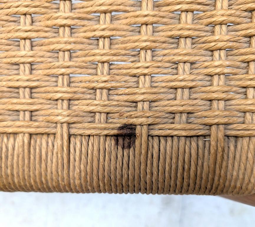 Gudme Mobelfabik Danish teak dining table with (6) J.L. Moller Models Danish teak chairs with rush seats. Table: 72.75" W, 42.25" D, 29" H.