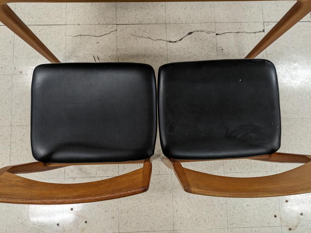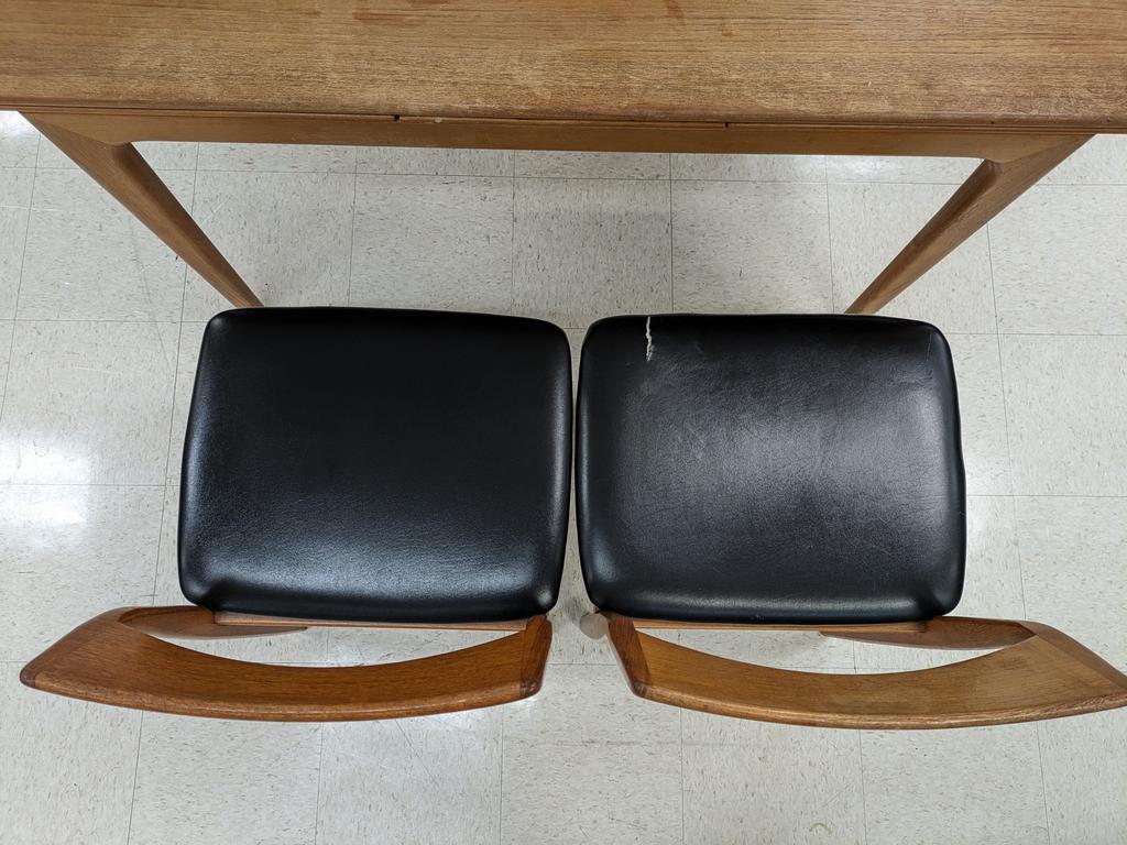Danish teak draw leaf table and 4 chairs with vinyl seats. Table with Uldum Mobelfabrik mark, chairs stamped Made in Denmark. Table: 53" W, 35.5" D, 28.5" H (leaves in), Chairs: 30.5" H.