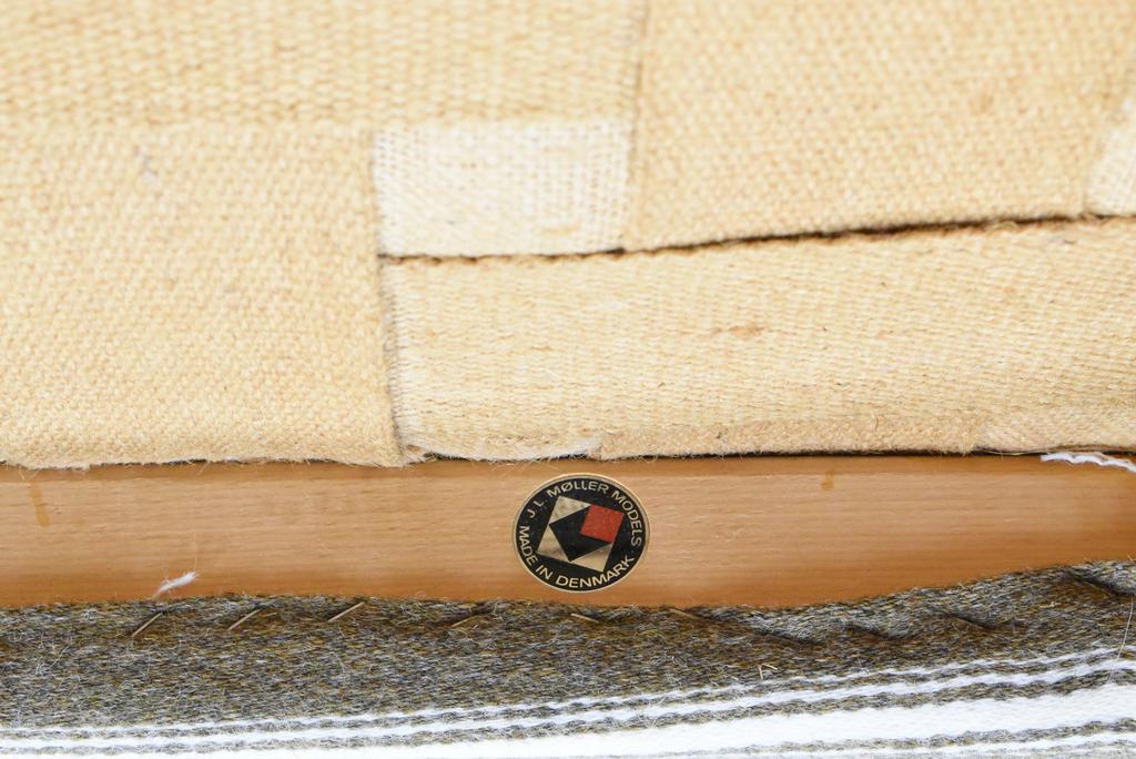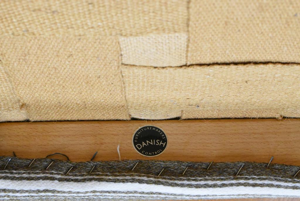 Danish teak draw leaf table with 6 chairs. Chairs marked Danish Furniture Makers Control. Table not marked. Chairs with striped cloth seats. Table: 52.25" W, 35.5" D, 29.25" H (leaves in), Chairs: 30.25" H.