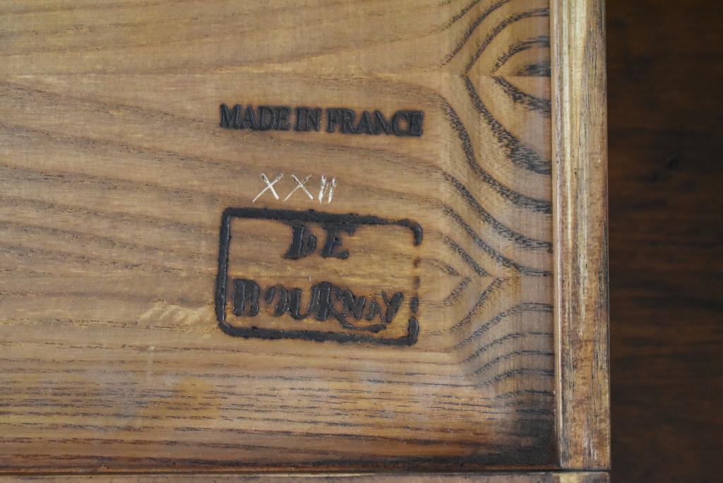 De Bournay French single drawer table. Red painted legs and sides. Underside of the drawer stamped De Bournay Made in France. 33 1/4" W, 18" D, 29 3/4" H.