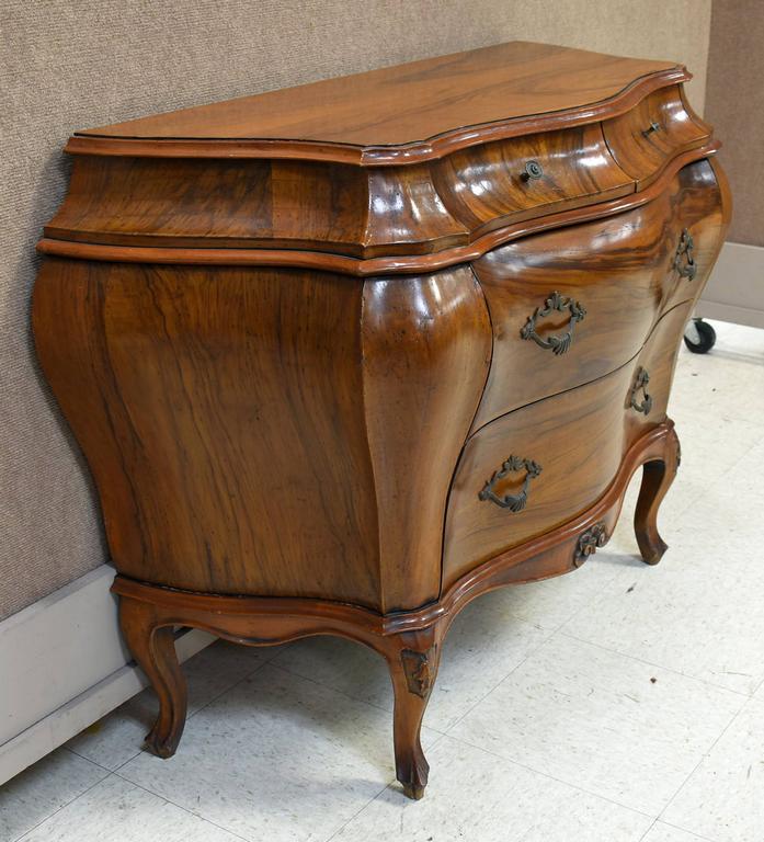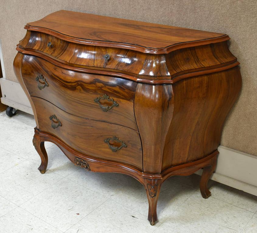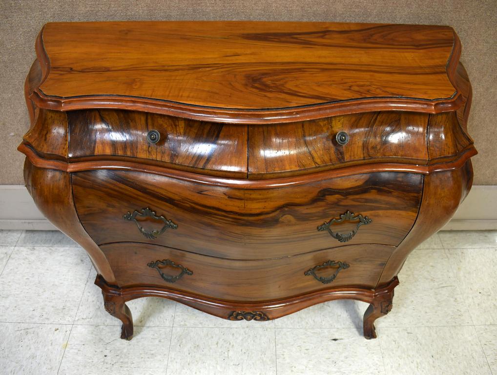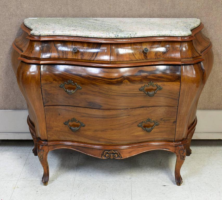 Dutch Baroque style walnut bombe 4-drawer chest with custom marble top. 44" W, 18" D, 32" H.