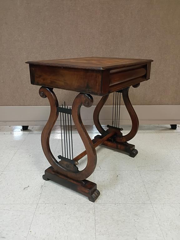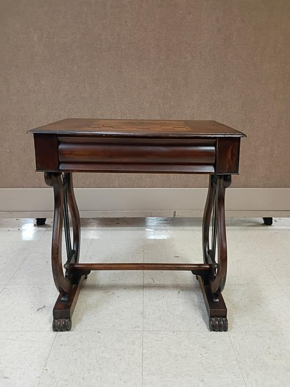 Early 20th C. Mahogany Games Table With Chessboard Top, Lyre Form Trestle Sides. 25" X 19" X 28".