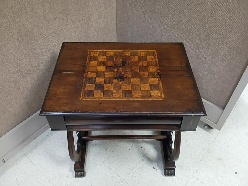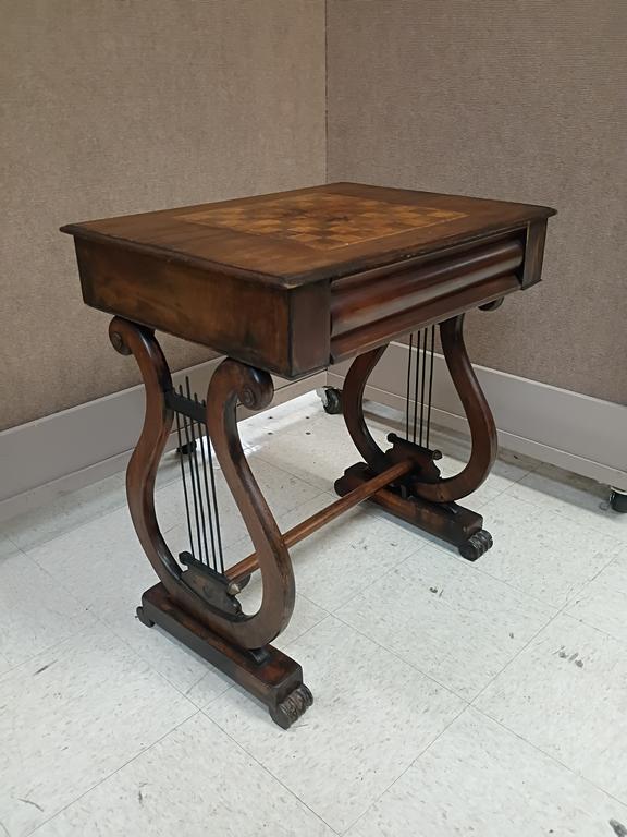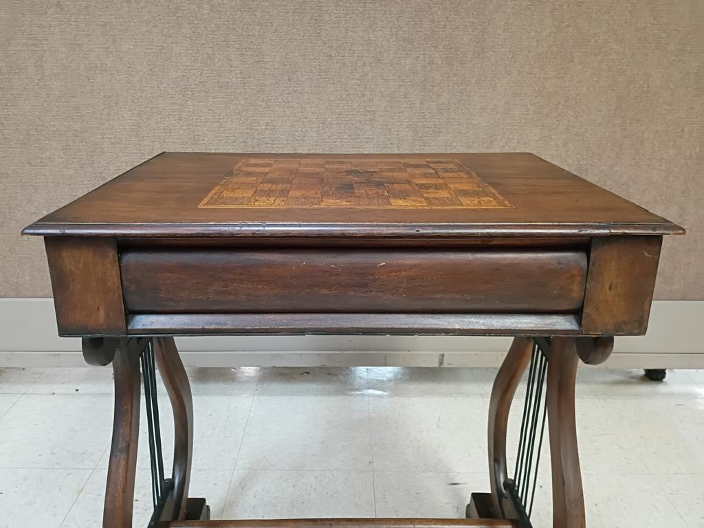 Early 20th C. Mahogany Games Table With Chessboard Top, Lyre Form Trestle Sides. 25" X 19" X 28".