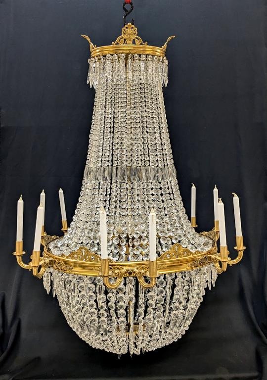 Empire Style Drop Crystal 12-Light Chandelier. Gilt Metal Circular Body With 12 Candleholders, Prism And Swag Garlands. 32" X 46".