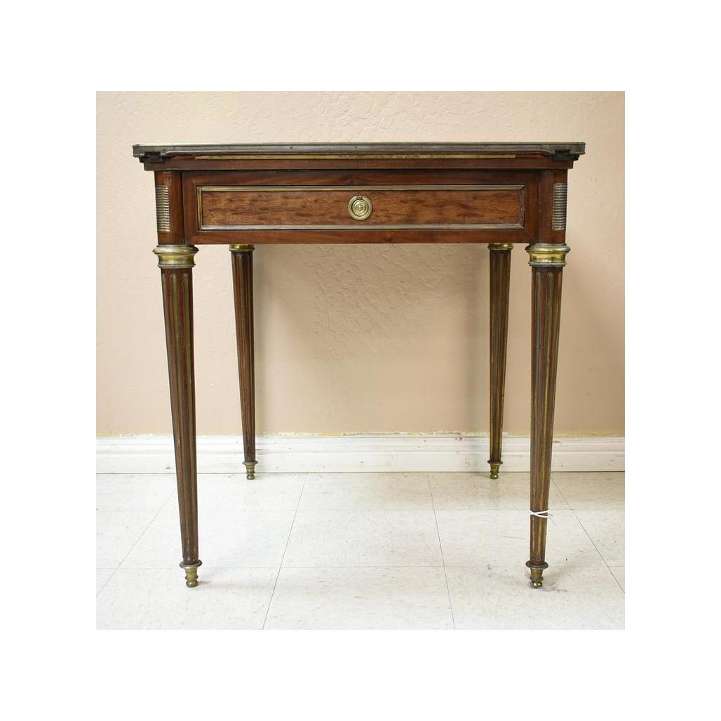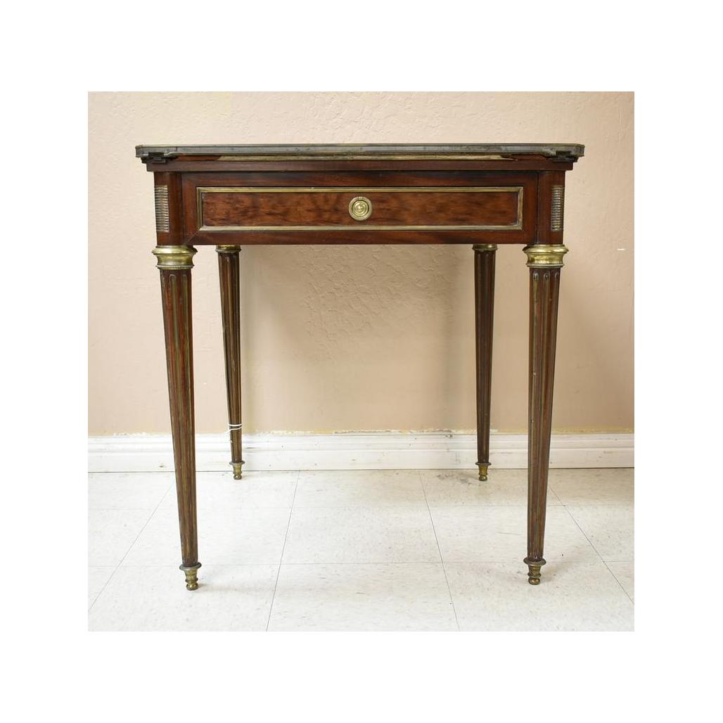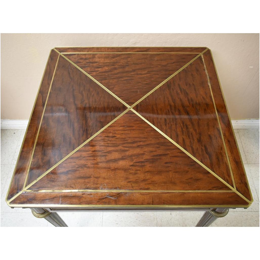 Empire style mahogany games table. Swivel top with 4 triangular fold outs opening to a felt top games surface. With 2 drawers. Closed: Approx. 28 1/4" x 28 1/4" x 30".