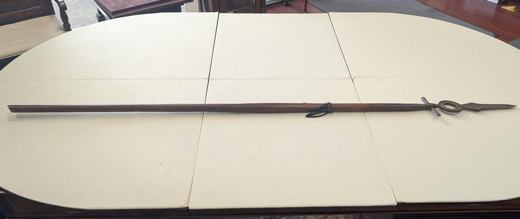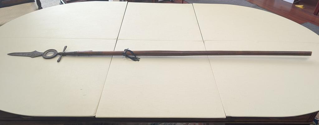 English Army, Suffolk Regiment, parade polearm with Latin motto "Stabilis." (pole head: 21 in. L, overall 75 in L) and a hand forged iron polearm head (overall 24.5 in. L)