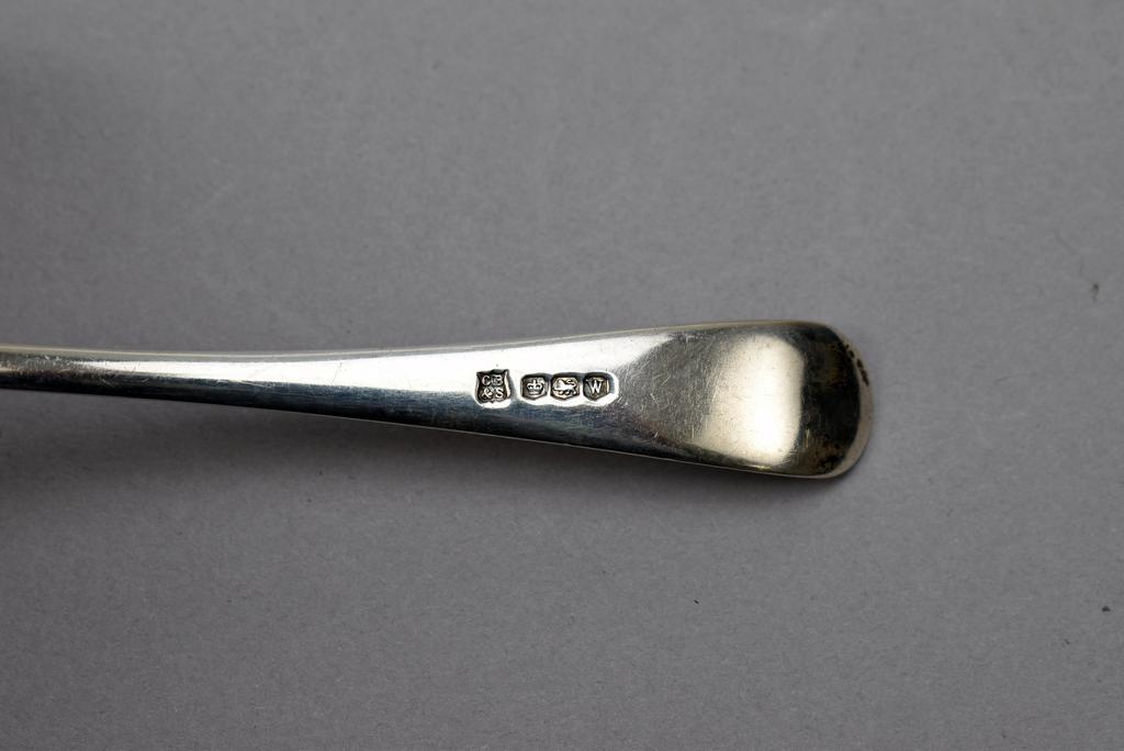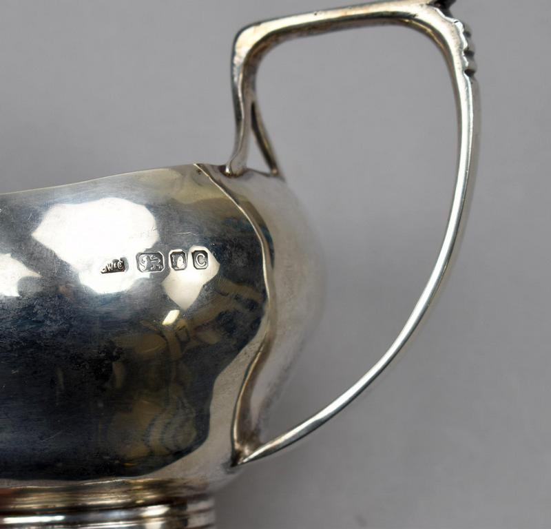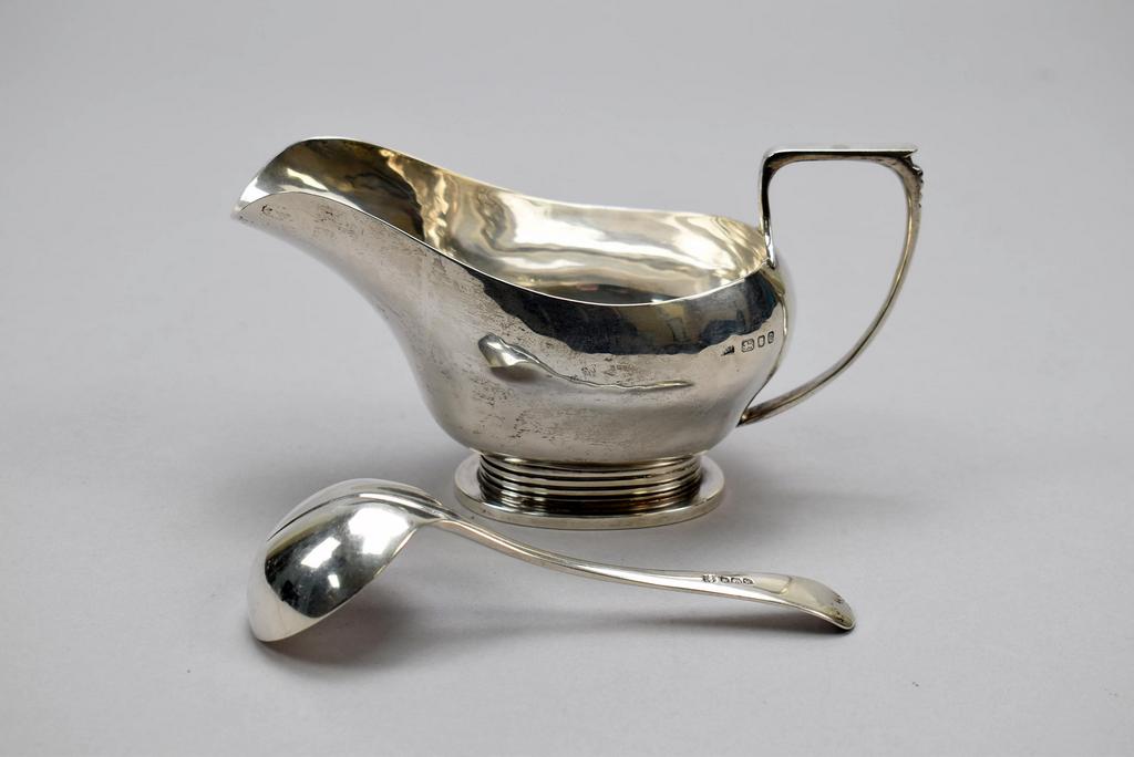 English Silver sauce boat and ladle. Josiah Williams London sauce boat & Cooper Brothers Sheffield ladle. Sauce boat: 6 3/4" x 3" x 3.5". 6.80 troy oz total.