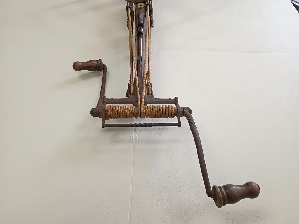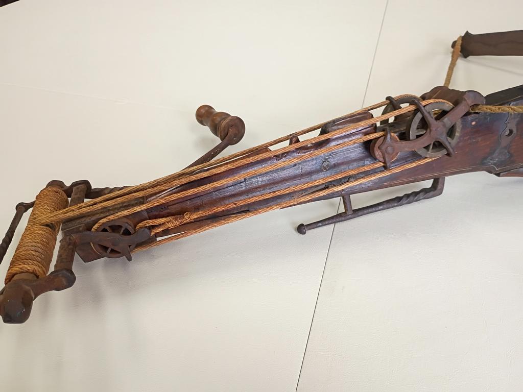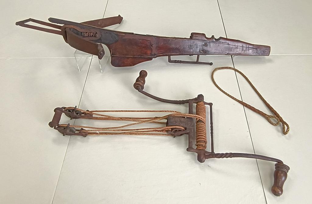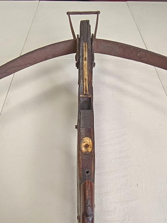 16th / 17th C. European siege stirrup crossbow and windlass. Steel lath (approx. 25.5 in. wide), stirrup, tickler, and windlass. Elm tiller with bone bolt guide. Tiller length approx. 31 in. Overall length approx. 42.5 in.