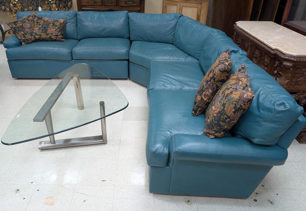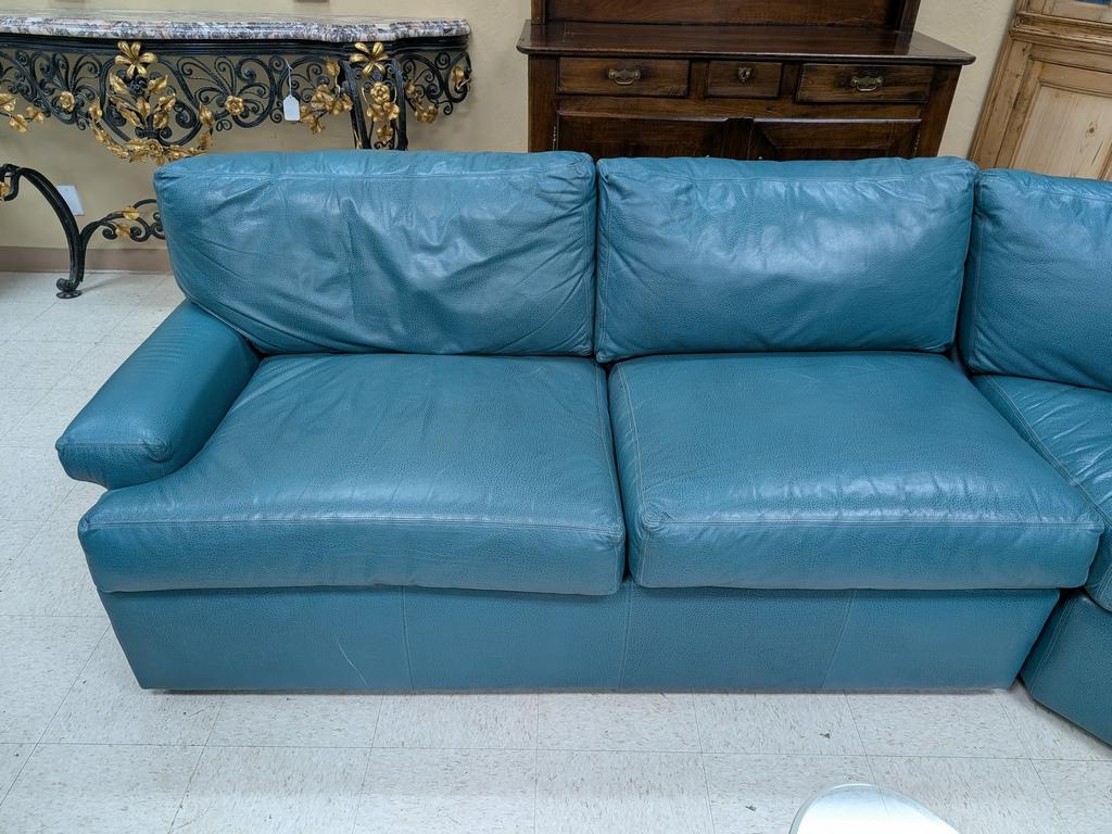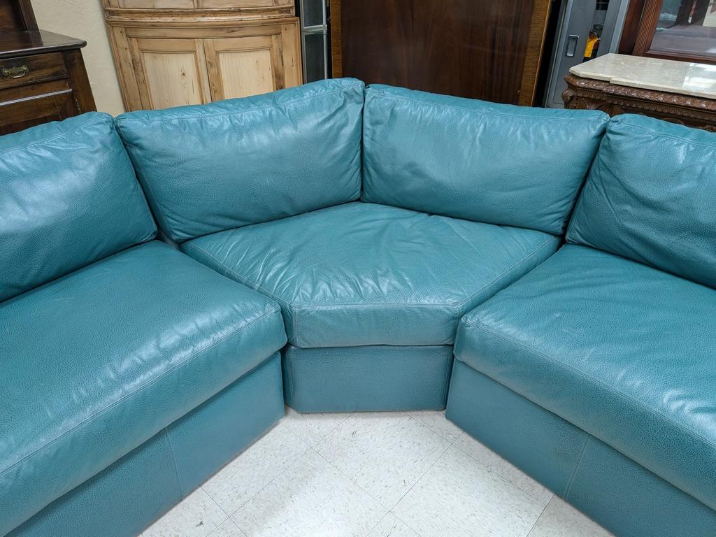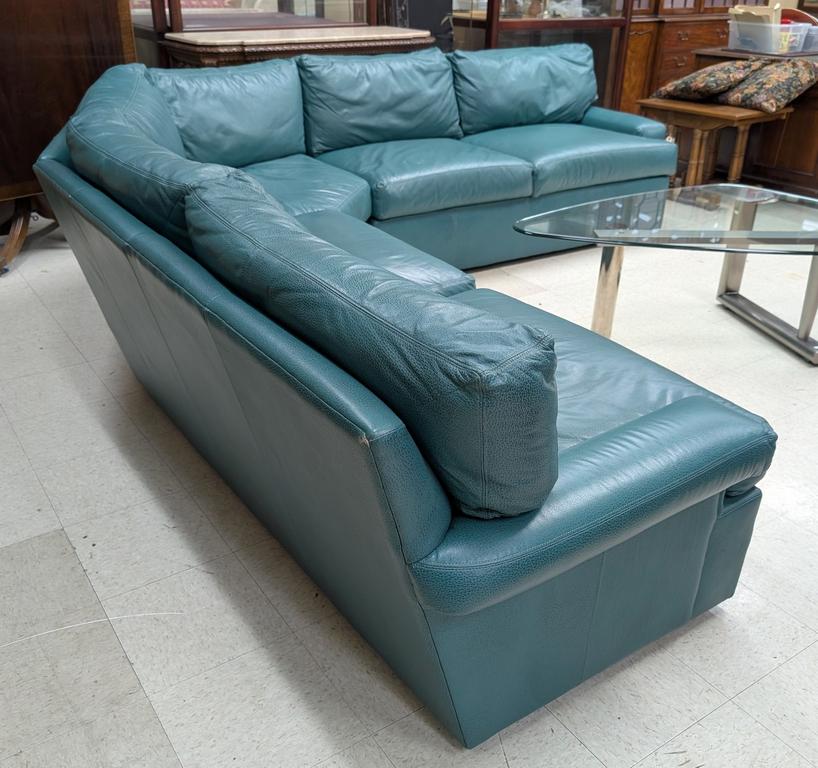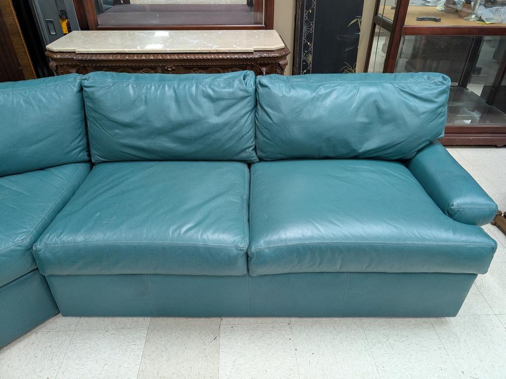 Expressions Custom Furniture Lackawanna green leather sectional sofa.