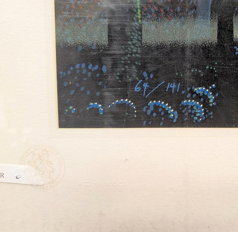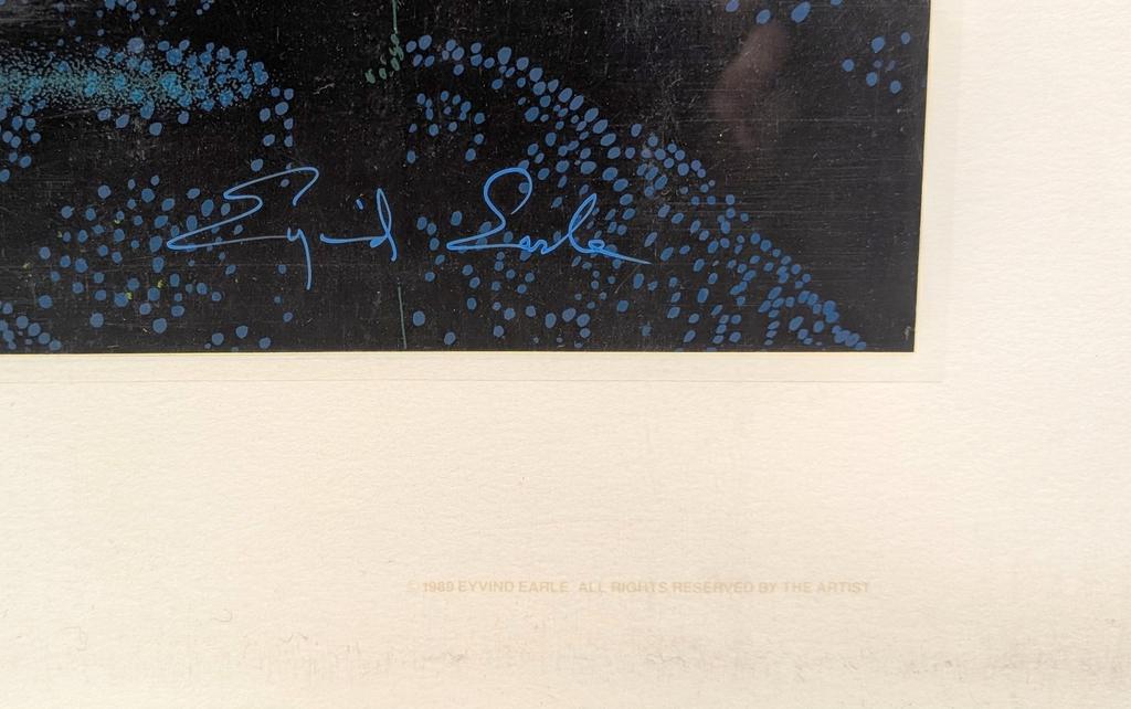 Eyvind Earle serigraph, Beyond Paradise. Signed, #64/141. Image: 25 1/4" x 37 3/4". Unframed. Overall: 32" x 44".