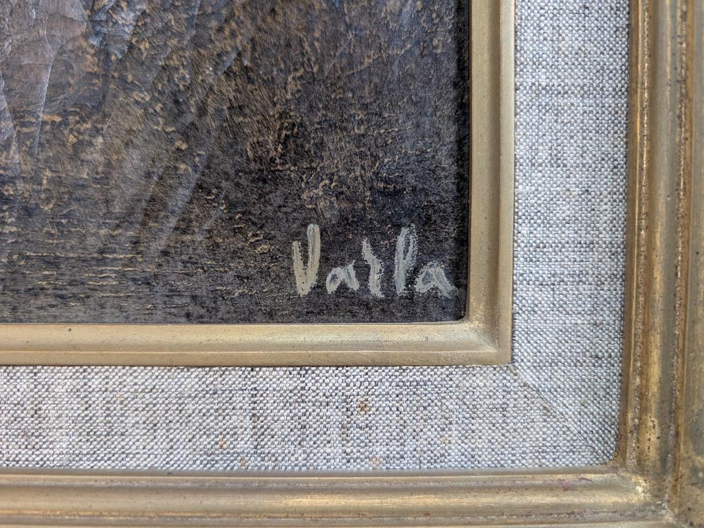 Felix Varla (1903 - 1986), Oil on canvas, Farm scene with workers and cows. Signed lower right, Varla. 15" x 18". Framed, overall: 19 3/4" x 22 3/4".