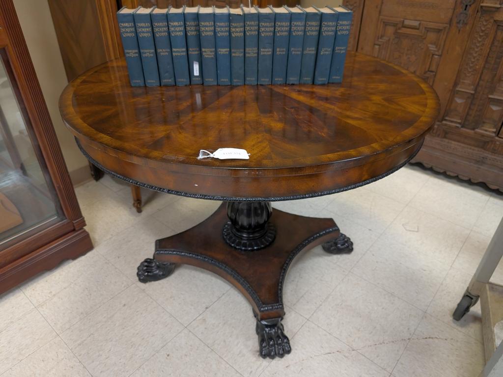 Flame Mahogany Circular Table With Pedestal Base And Paw Feet. 42" Dia, 30" H.