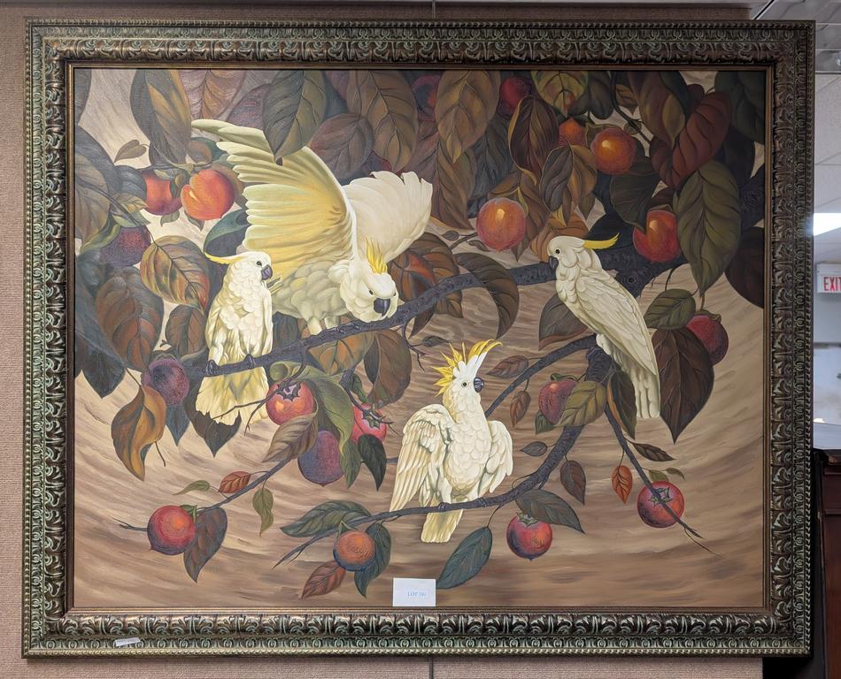 Framed Oil On Canvas, Persimmons And Cockatoos, Signed A. Panu. 40" X 50". Framed.