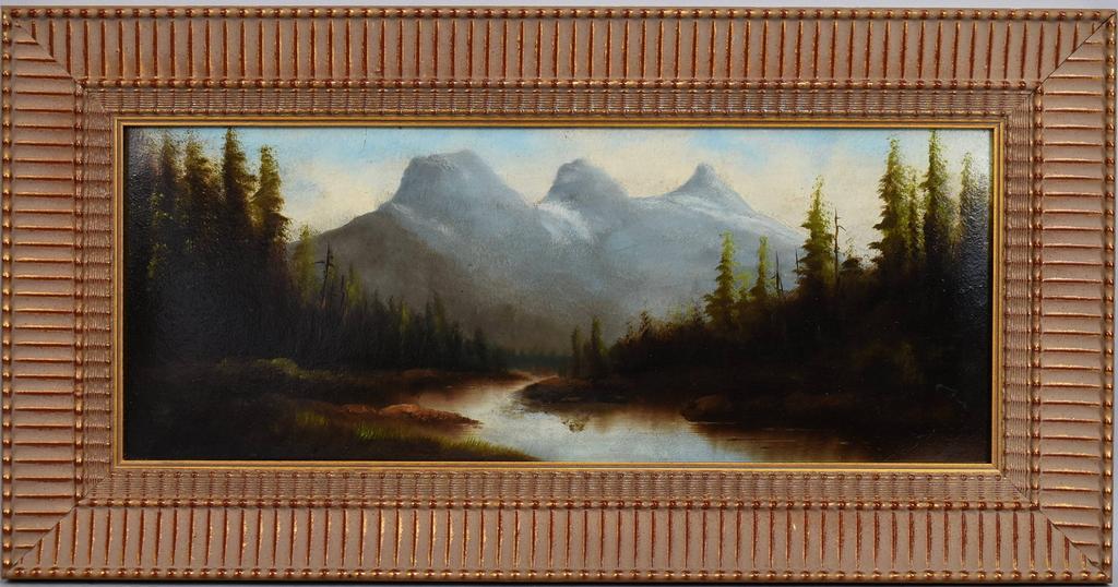 Framed Oil On Canvas, Three Sisters (Alberta Mountains). Signed Lower Left. 8" X 20". Gilt Framed.