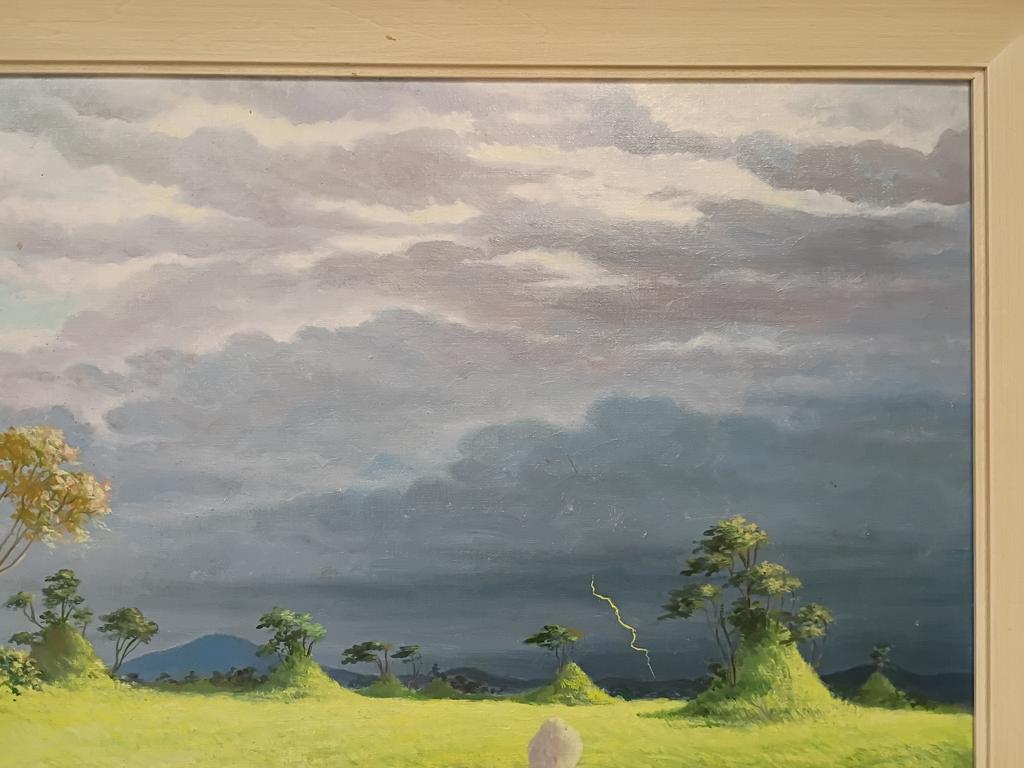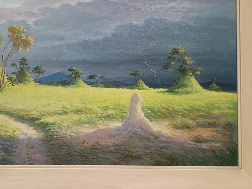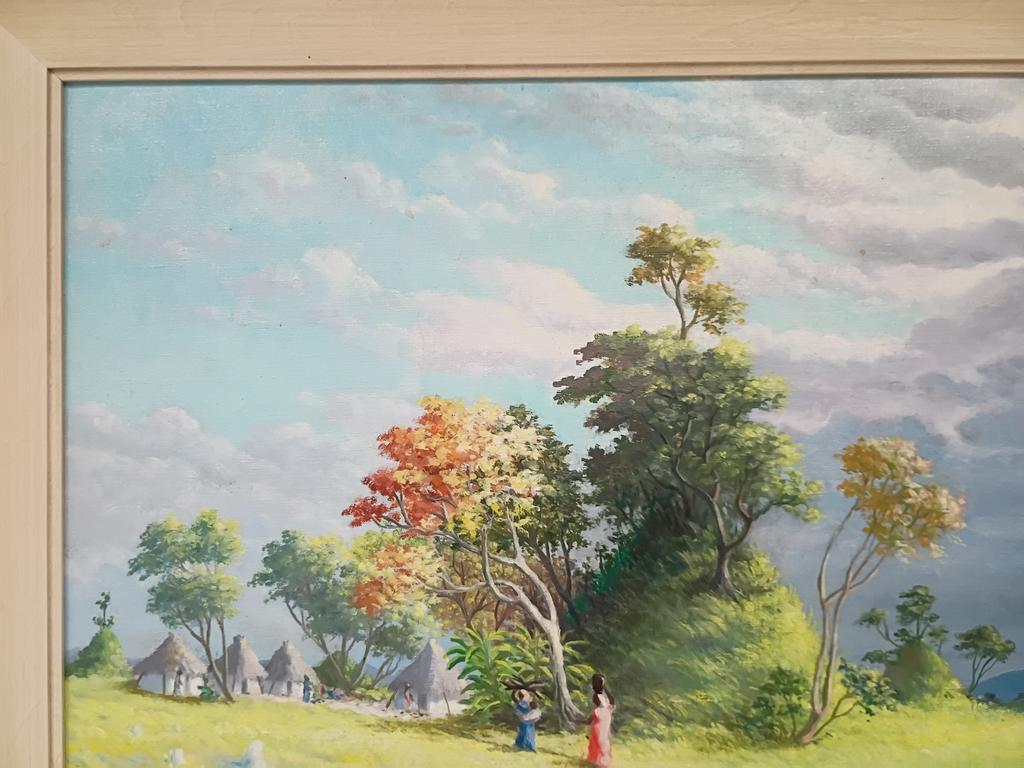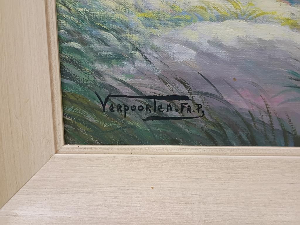 Franz Verpooten Oil On Board, Country Landscape With Dwellings. Signed Lower Left. 36" X 20". Framed. O/A: 40" X 24.5".
