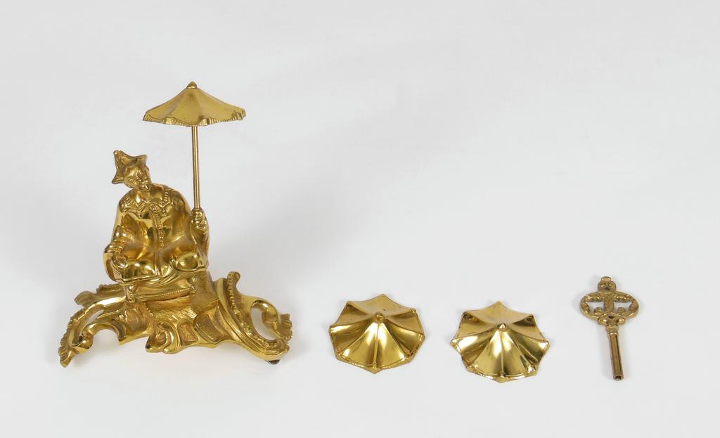 French Louis XV style gilt bronze "elephant" mantel clock. Seated Oriental man form finial. porcelain clock face with Roman numerals (marked Chardon Paris) resting on a brown patina elephant figure. Time and strike. 19th Century. 12.5" W, 5.5" D, 15.5" H. With a spare finial of an seated Oriental man holding an umbrella.