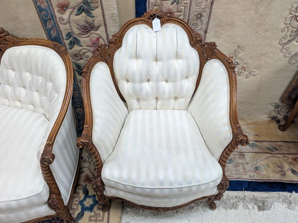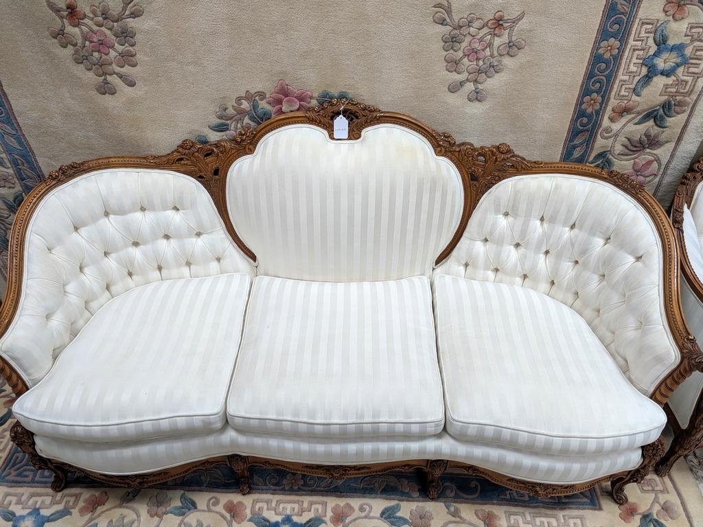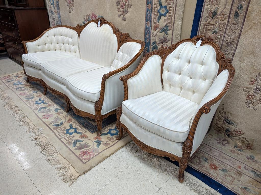 French Provincial Style White Upholstered Button Tuft Settee and Armchair.