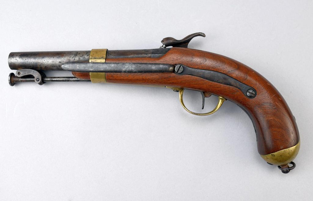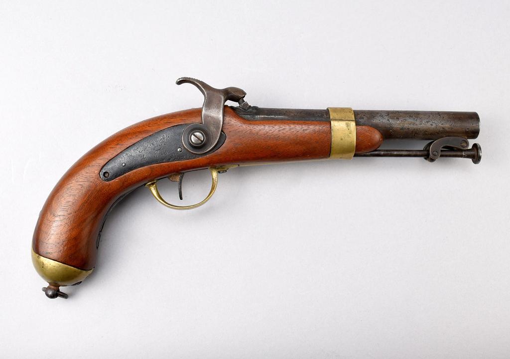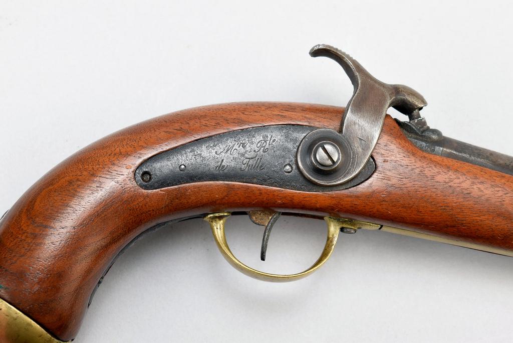 French Tulle model 1837 percussion cap pistol with belt hook and articulated ramrod. 60 caliber, 6 inch round barrel. Barrel tang engraved "M're 1837". Lockplate engraved "M're R'le de Tulle" (Manufacturer Royale du Tulle). Brass barrel ring, trigger guard, butt cap and walnut stock.