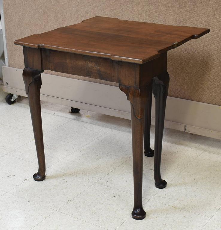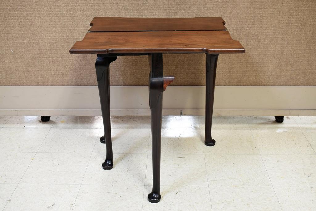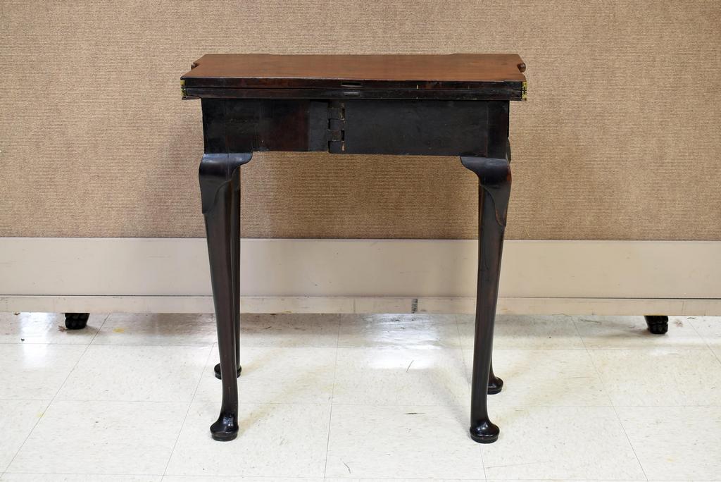 George II mahogany fold over table. Rectangular top with square outset corners, lappet carved turned legs. 26" W, 13 1/2" D, 28" H.