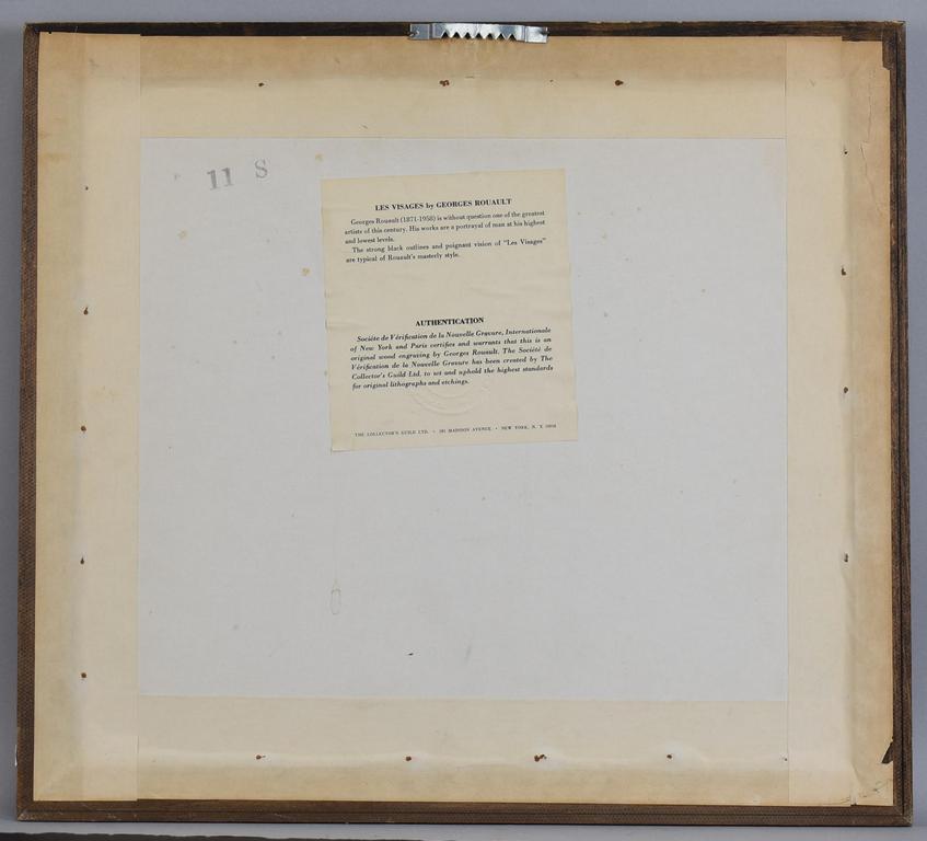 Georges Rouault etching, Les Visages. Plate signed. Image: 6" x 7 3/4". The Collector's Guild label with Societe de Verification de la Nouvelle Gravure stamp on the back.Framed. Overall: 15 1/4" x 17 1/4".