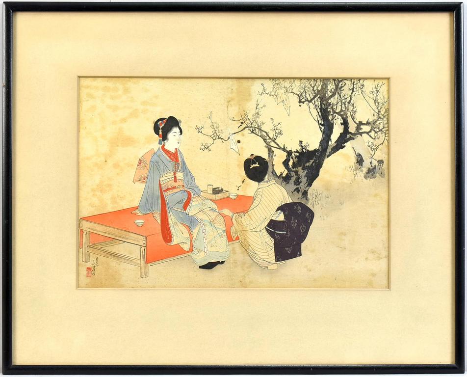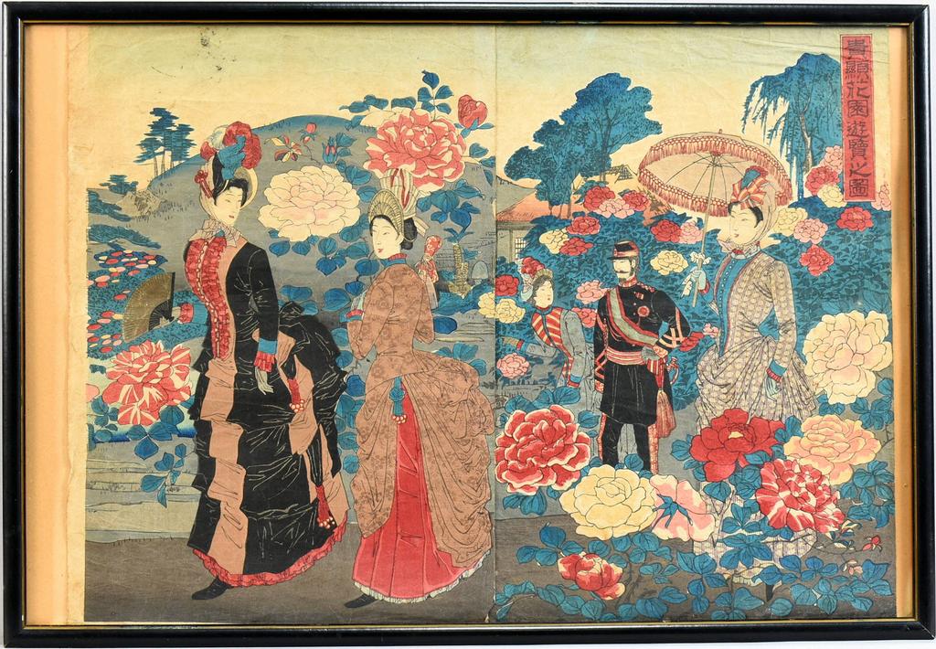 Group of (4) Japanese woodblock prints. Seated woman, Man on a horse, seated women in garden, diptych. Artists include Kunisada, Yoshitora. Framed: Largest: 15" x 21 1/4" overall.