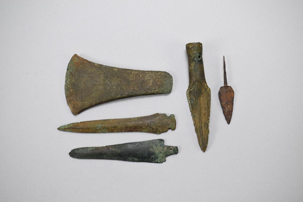 Group of Bronze Axe and Spear Heads. Axe head: 3.5 in. W x 6.25 in. L. Spear head range from 4 in. to 6.5 in in length.
