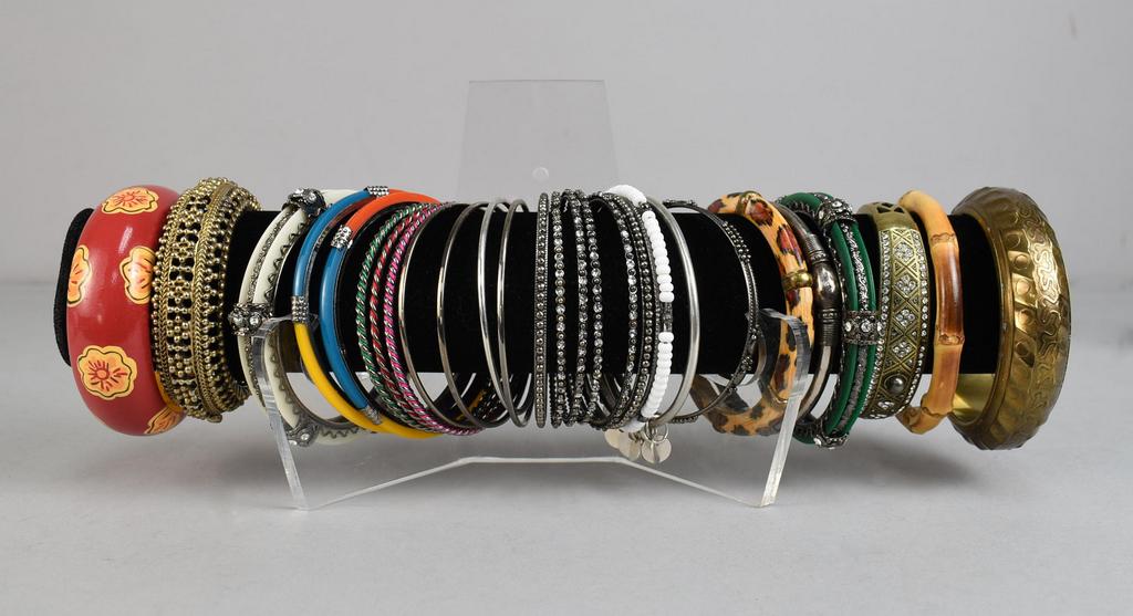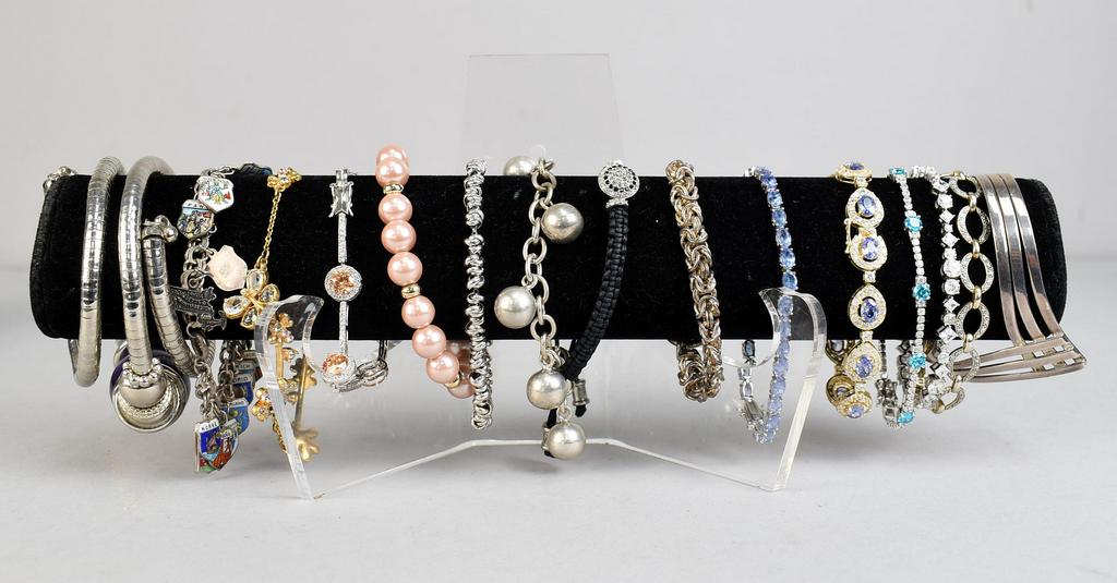 Group of costume and bangle bracelets including sterling, some with gemstones.