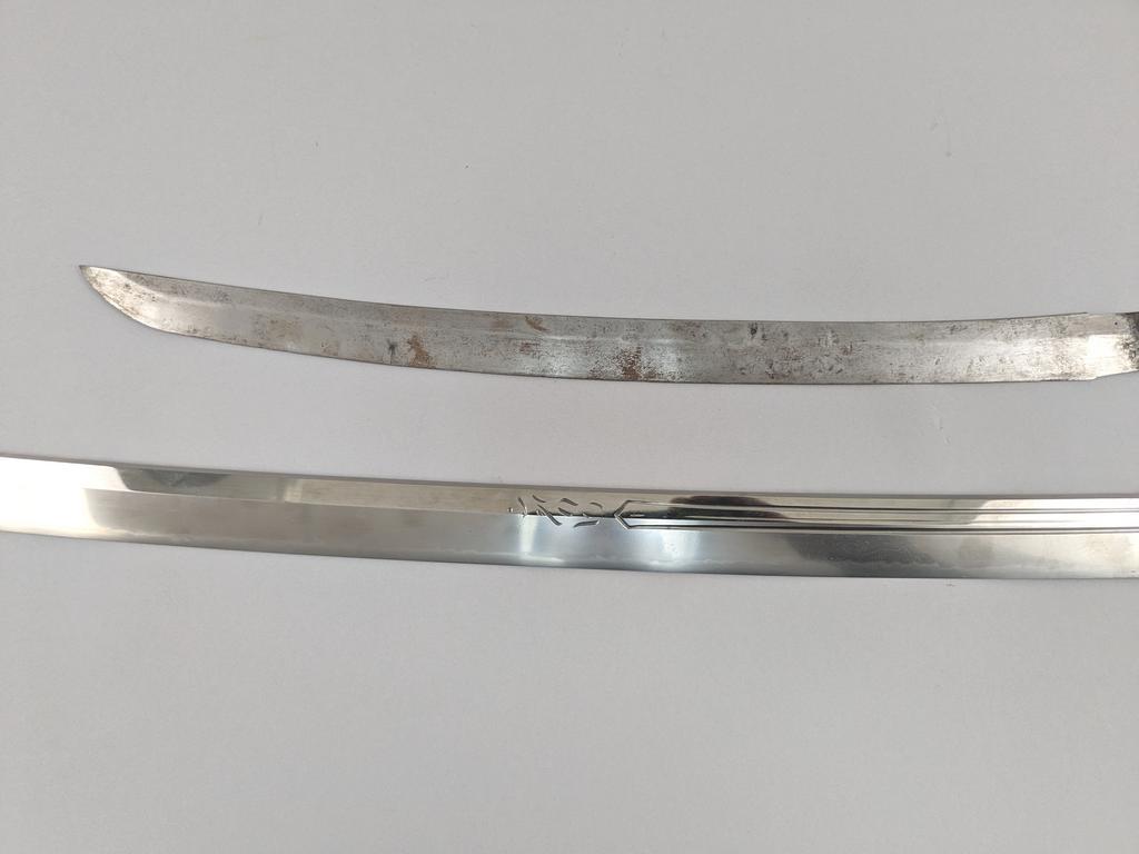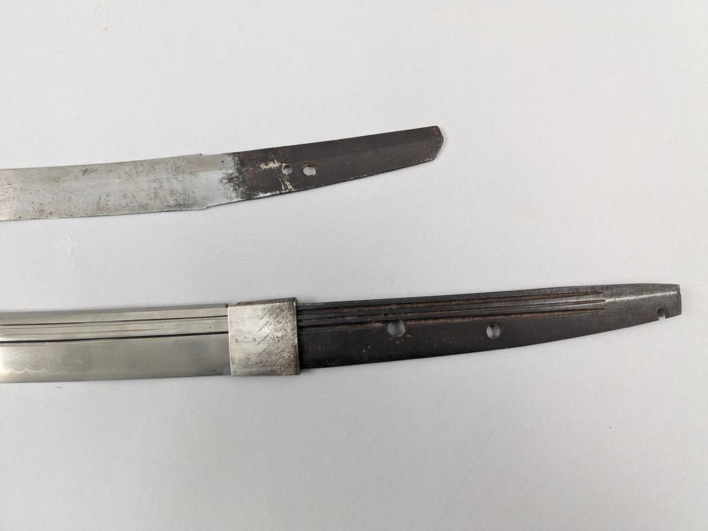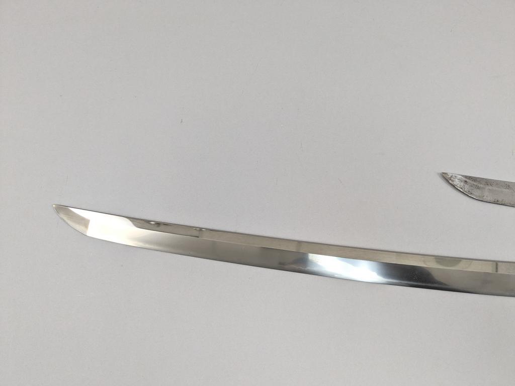 Group of Japanese sword blades, handles and scabbards. Including 37-inch contemporary katana blade with cut stock handle and scabbard, 19.5 inch wakiazashi blade, braided tsuka, braided saya and lacquered saya.