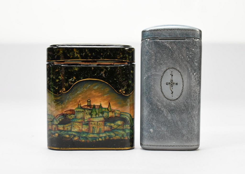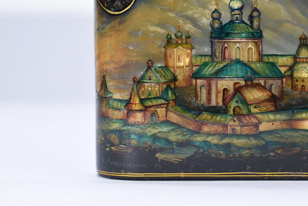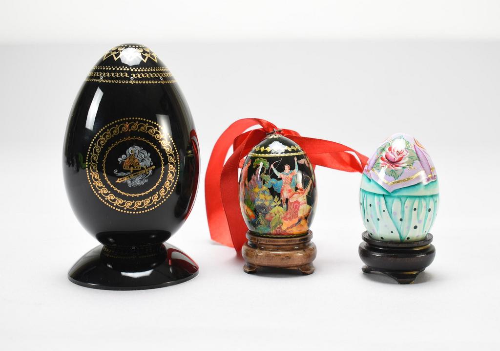 Group of Russian lacquer boxes and eggs. Include Palekh, Kholui and Fedoskino boxes. Largest: 7" x 2" x 1 1/4".
