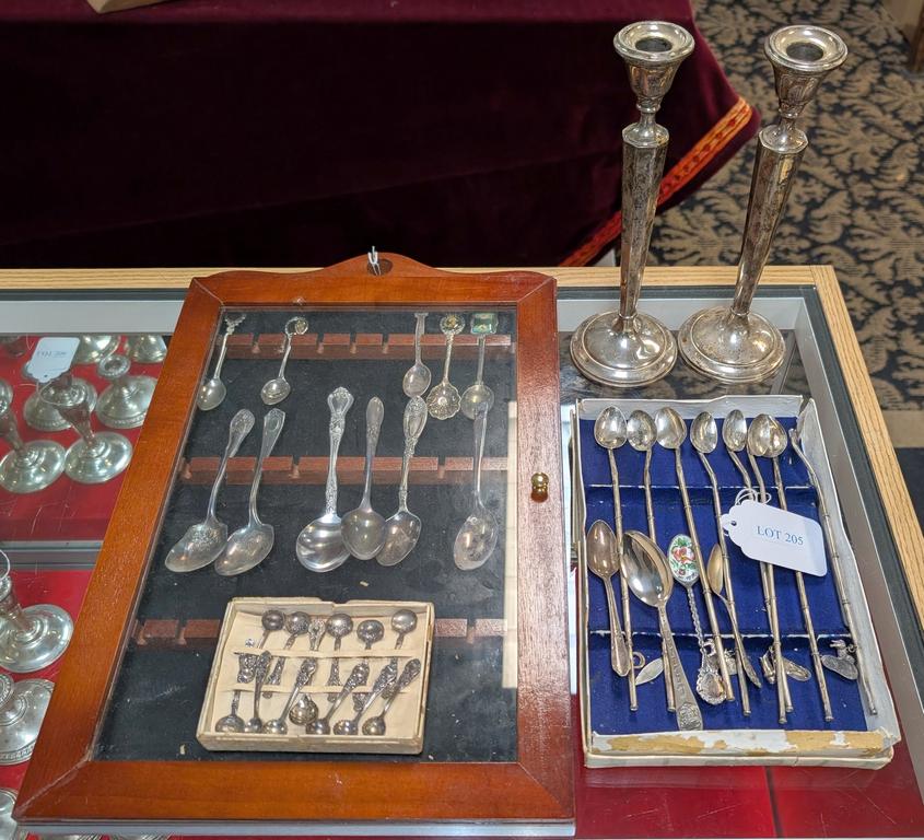 Group Of Silver & Plated Items Incl. 2 Weighted Candlesticks, Lemonade & Demitasse Spoons.