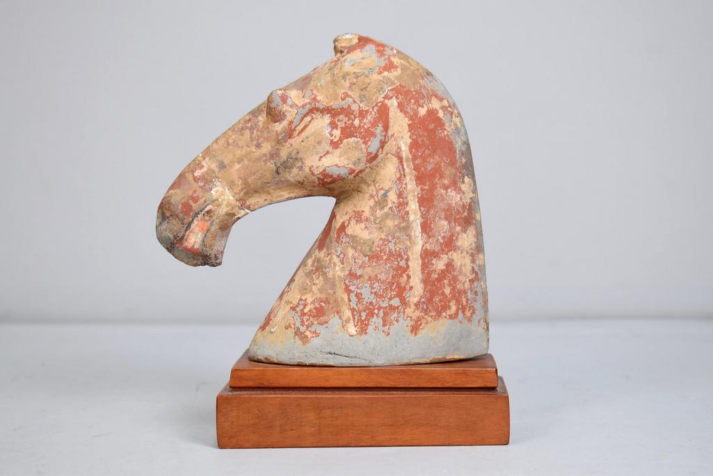 Han Dynasty pottery horse head with traces of red paint. 6 1/2" W, 6 1/2" H. On a fitted stand.