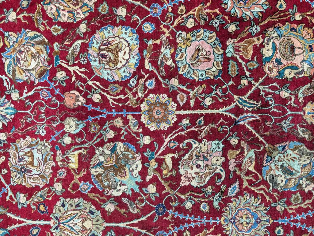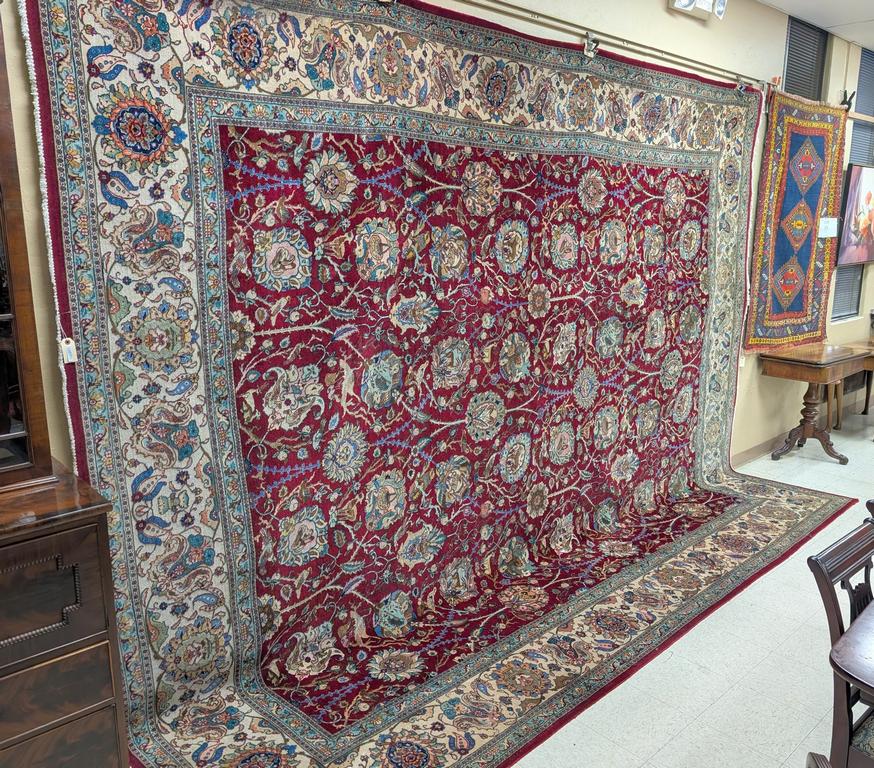 Hand Knotted Oriental Rug. Red Field With Floral Decoration And Beige Borders. 13.5' X 11'.