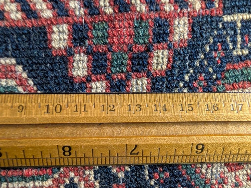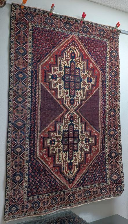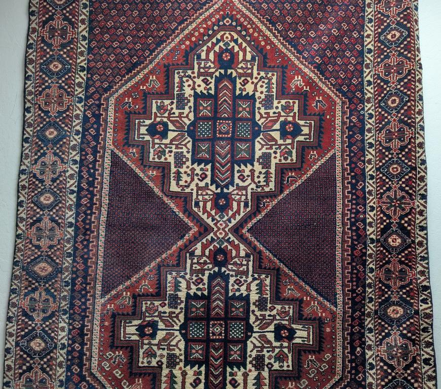 Hand knotted Sumac medallion rug with 2 medallions and spandrels. 6'4" x 4'4".