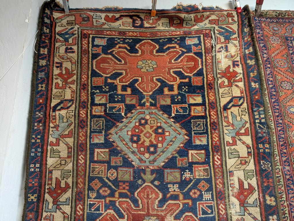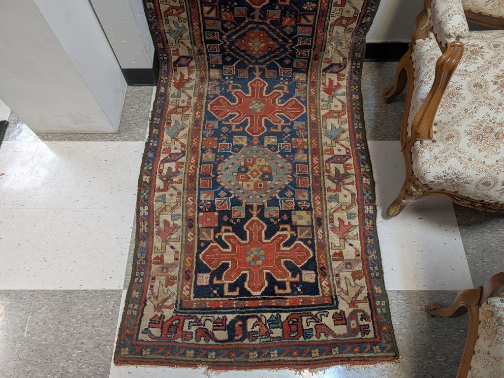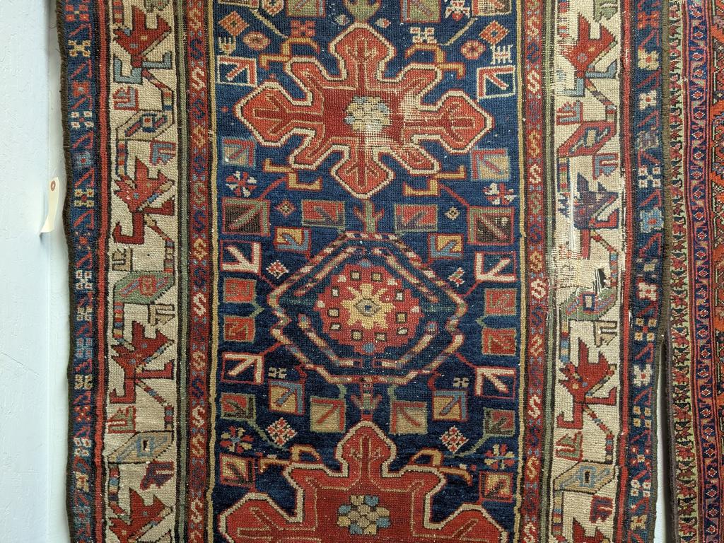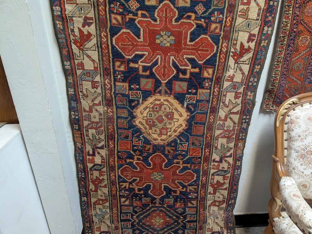 Hand knotted tribal runner with alternating medallions. 13' x 3'. Some losses.