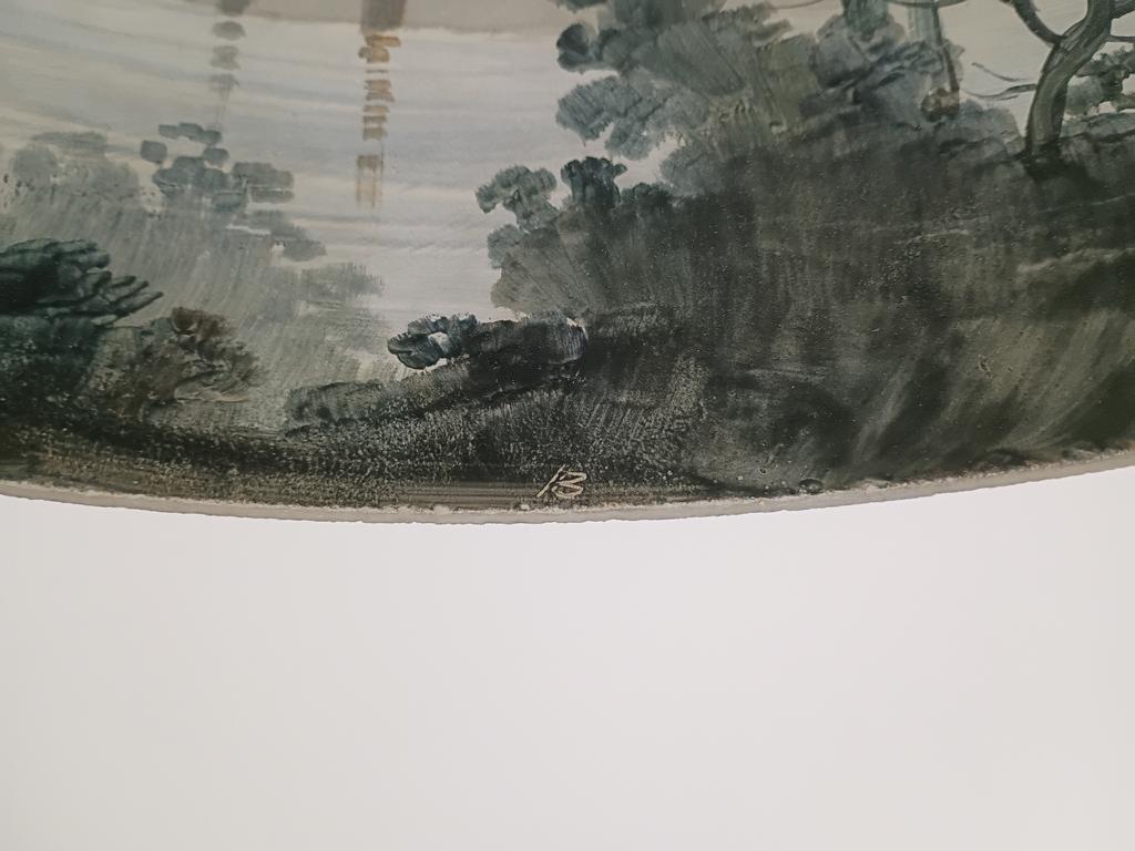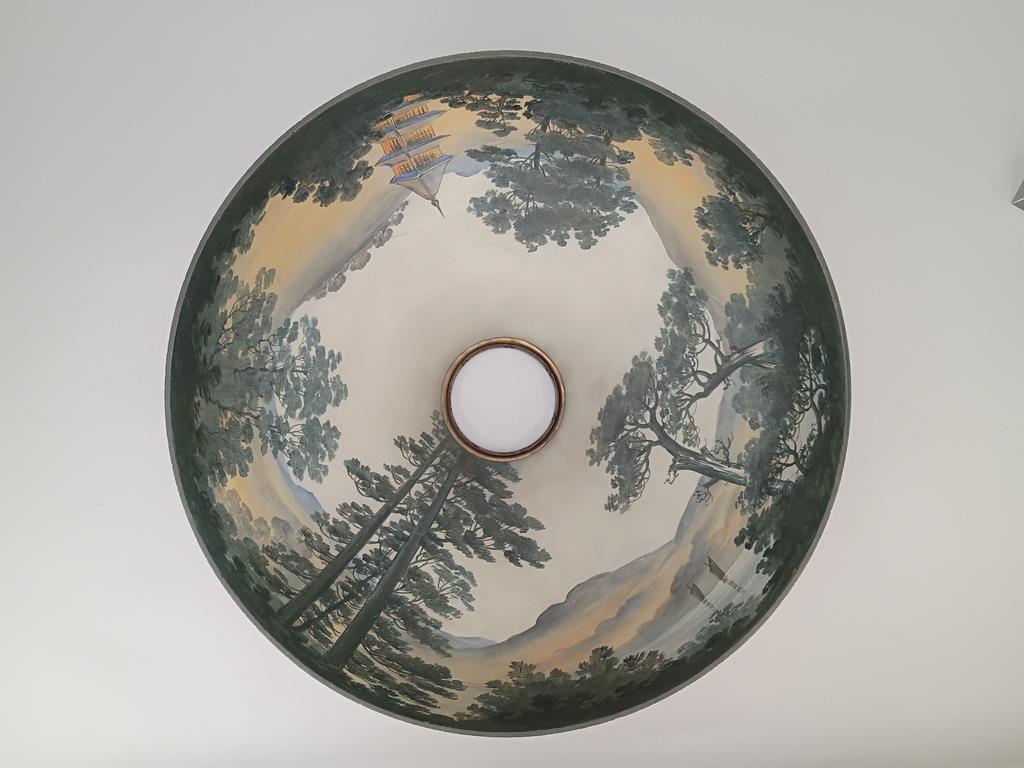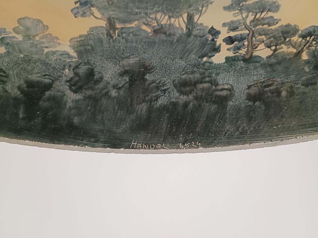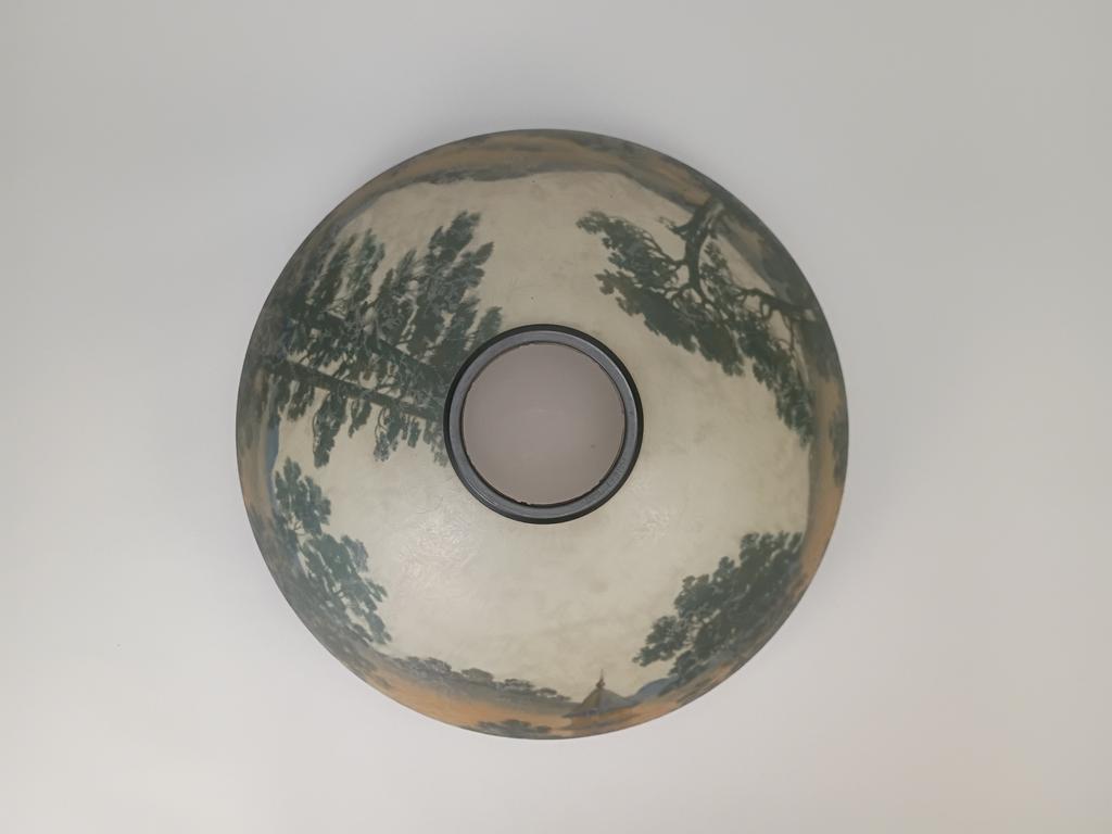 Handel patinated metal "Japanese Pagoda" lamp. Dome shaped shade interior painted with Japanese landscape of pine trees, boats, pagoda & mountains, marked HANDEL 6529. Patinated metal base (unmarked). 24" tall, shade: 22" diameter.
