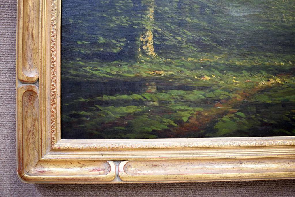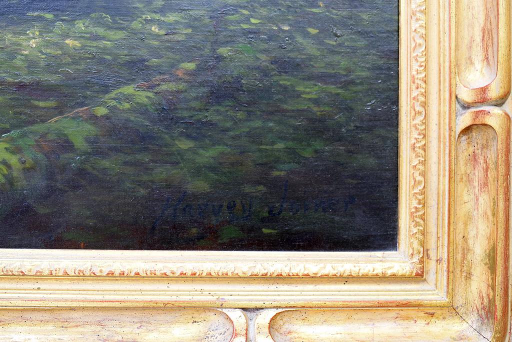 Harvey Joiner (1852 - 1932), Oil on canvas, Forest landscape with sunlight filtering through the trees. Signed lower right. 30" x 44". Gilt framed, overall: 35" x 48".