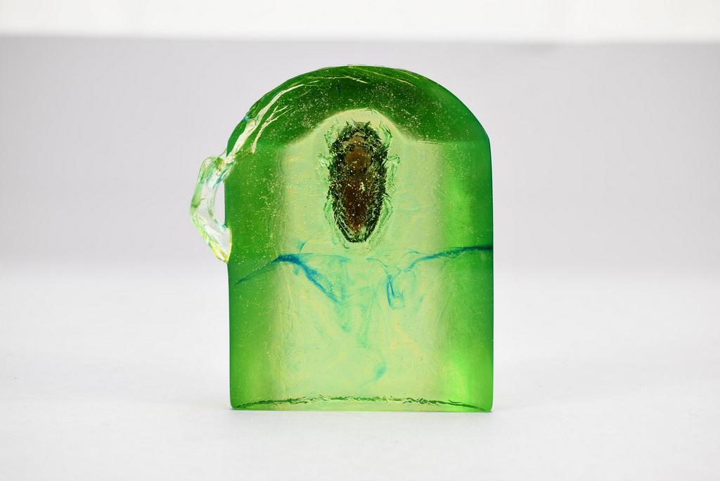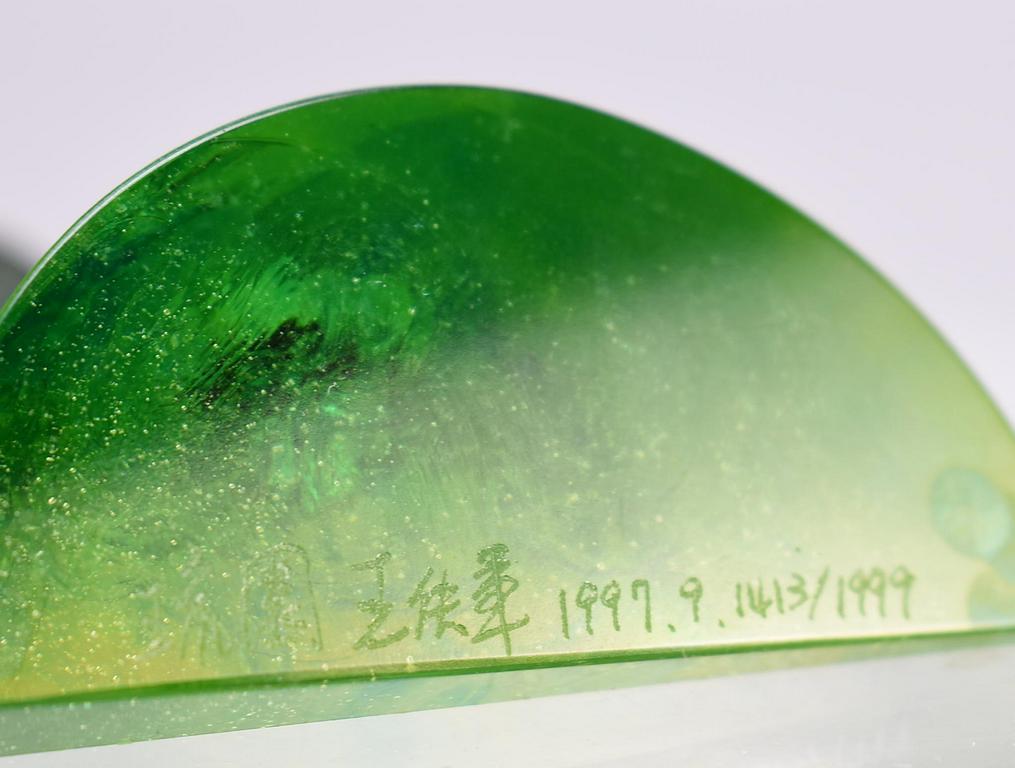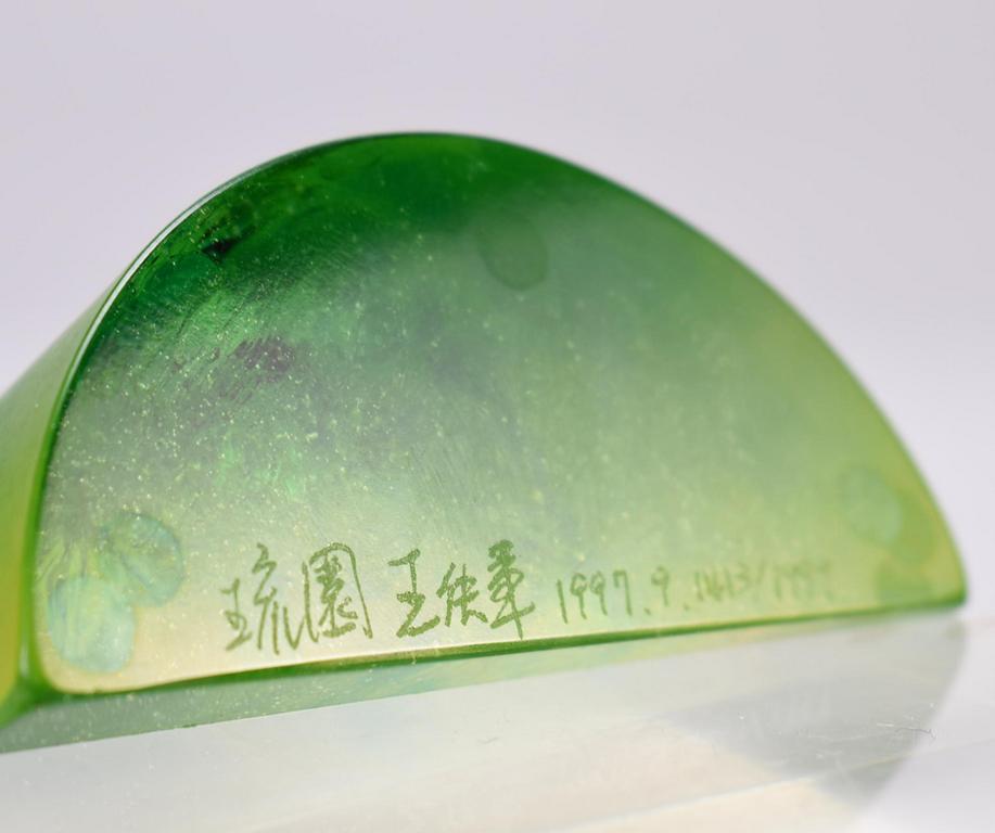 Heinrich Wang Oriental art glass paperwight, Cicada in green glass. Signed, dated 1999. 4 1/4" x 3 5/8" X 1 3/4". With box.