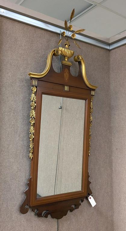 Hepplewhite Style Mahogany Framed Mirror With Inlay. Gilt Crest And Floral Rosettes. 50" X 21".