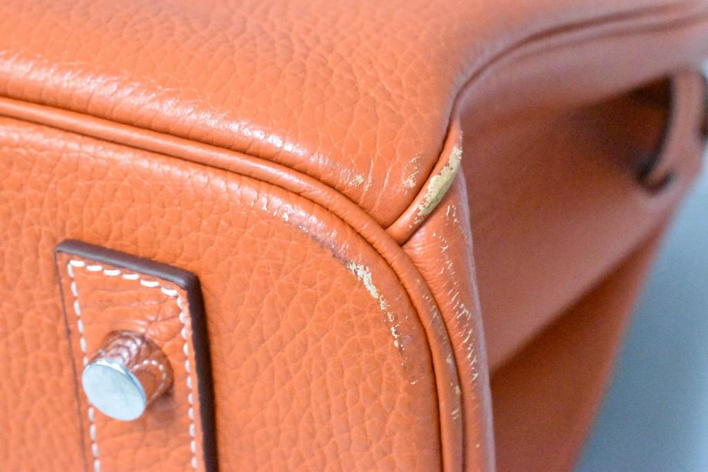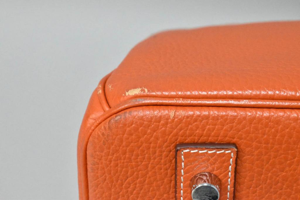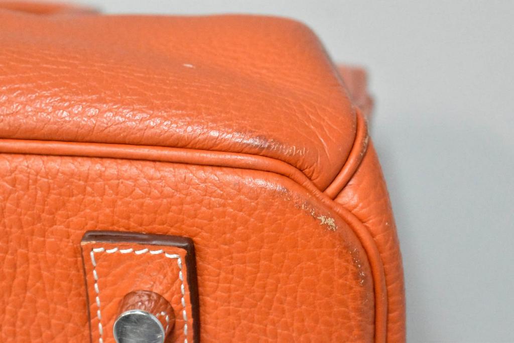 Hermes Birkin bag, Birkin 40. Orange leather luxury bag with lock, 16" W, 12" H, 8" D. 2 keys and a cloth bag. Used. Per Consignor, replacement lock and 2 keys were provided by Hermes Store in Palo Alto, California.