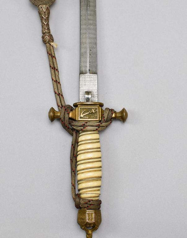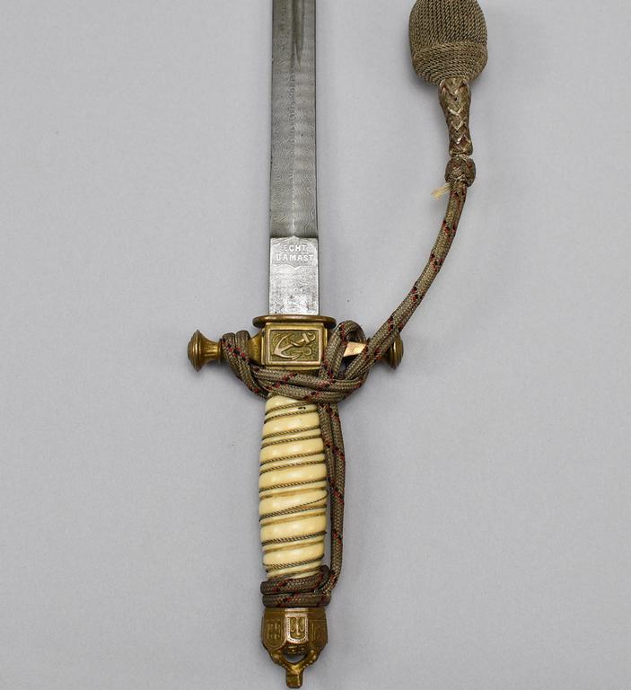 Imperial German Naval officers dagger with portepee and scabbard. Damascas steel double edged bi-fullers blade marked "Echt Damast" on the ricasso. Bronze cross guard with anchor and crown pommel nut. Embossed and hand tools scabbard with crown and anchor emblem.