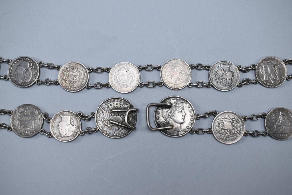 International Silver 24-coin belt. Various pre-1908 coins bookended by 1905 U.S. half dollars.