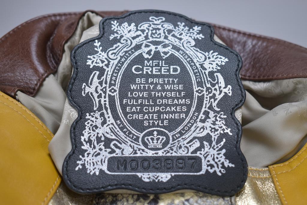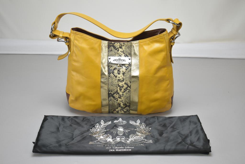 Jan Haedrich My Flat in London shoulder handbag. Reptile brown and mustard leather with hold foil contrasts. Original black satin dust cover.
