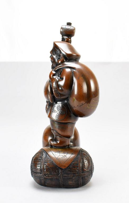 Japanese bronze figure of god Daikokuten holding a mallet, standing on 2 rice bales. Personalized inscription on the back dated 1959, 11 1/4" H, 6" W, 4 1/4" D.
