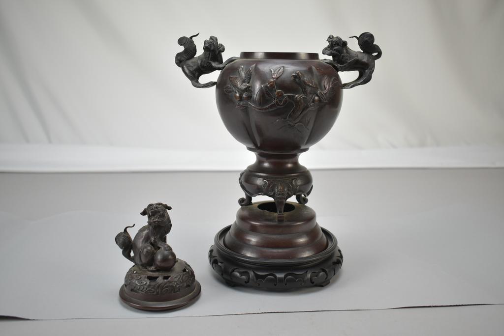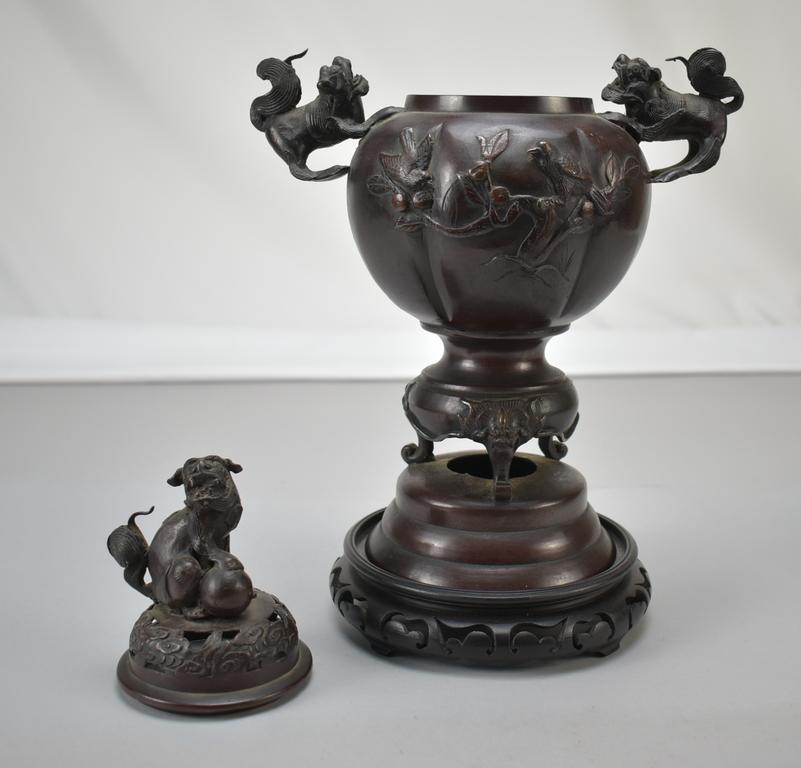 Japanese bronze lidded censer. Lobed vessel with bird on branch decoration and beast figural handles. Beast finial with foot on ball. 9 1/2" x 6 1/2" x 13".