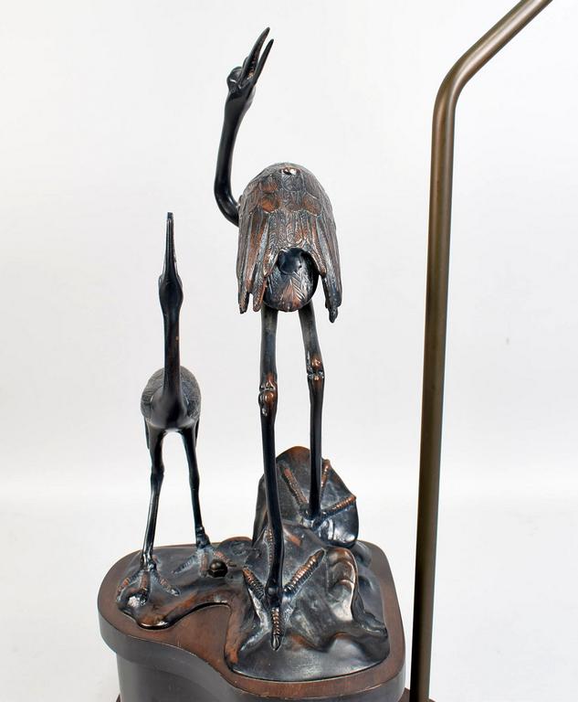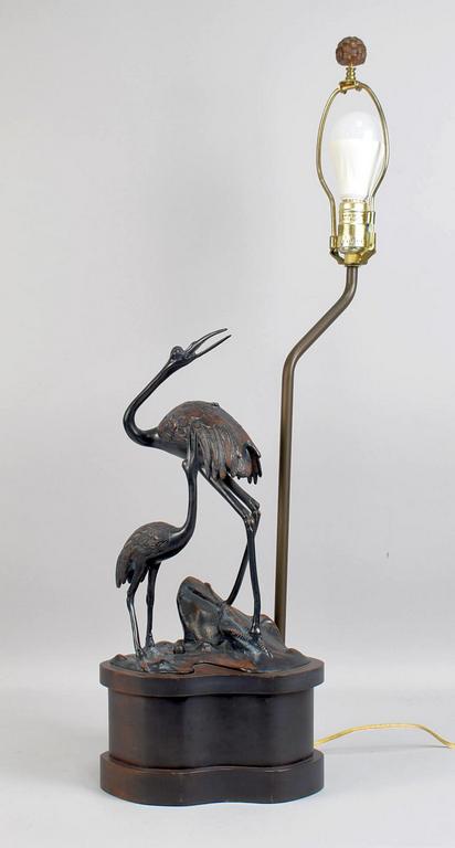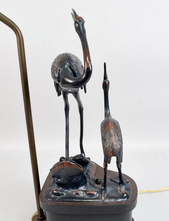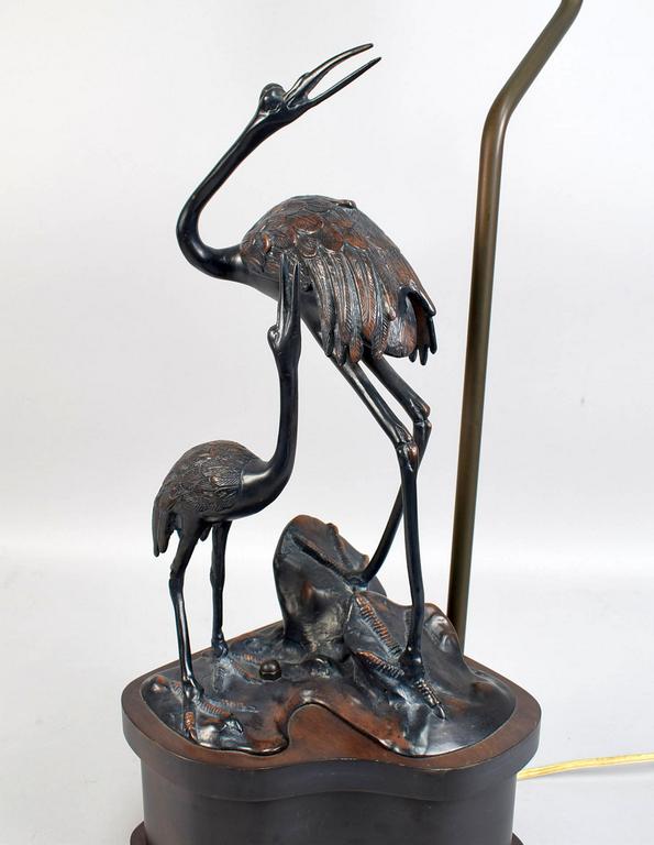 Japanese Bronze "Two Cranes" Table Lamp On Wood Base.
